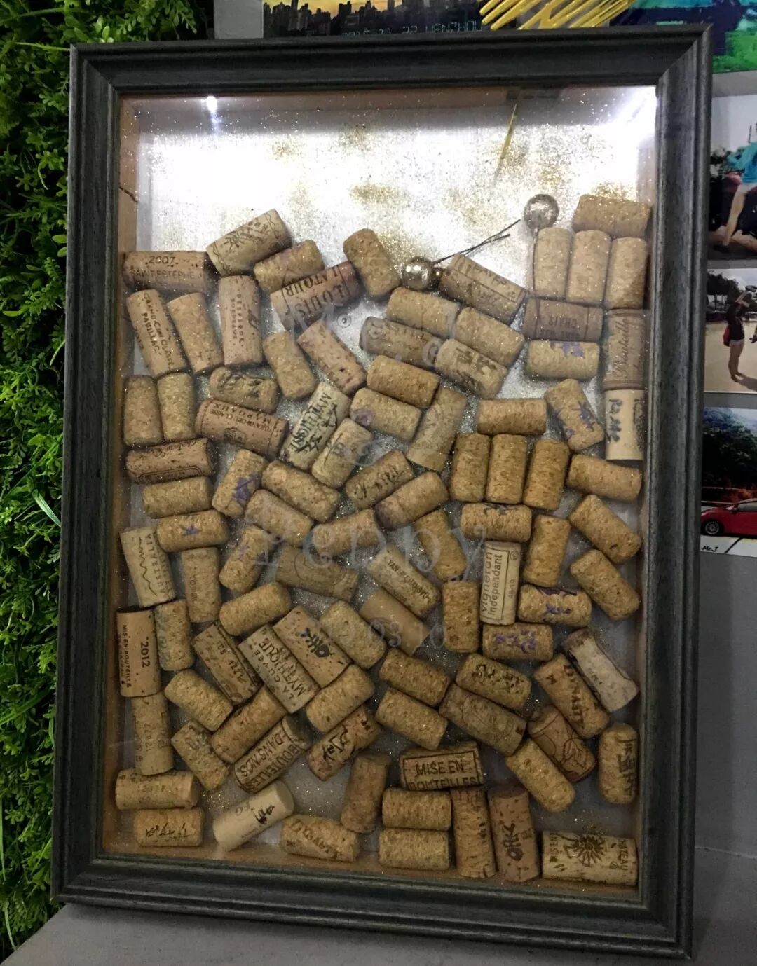 签到处这块的设计我也想了很久,最后选择这种很有创意的签到方式。朋友们可以把名字签到红酒塞里,最后统一装框,可以挂在家里当艺术品。
