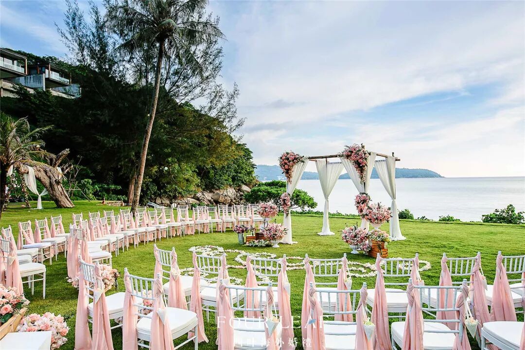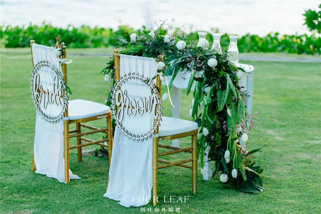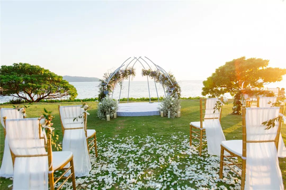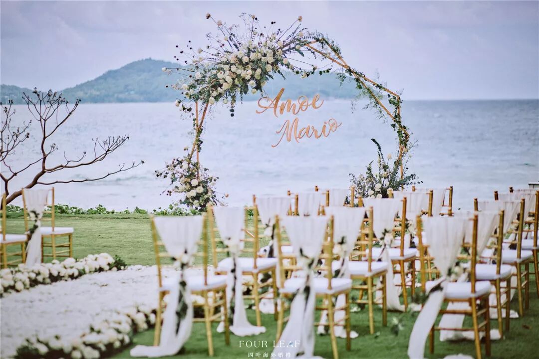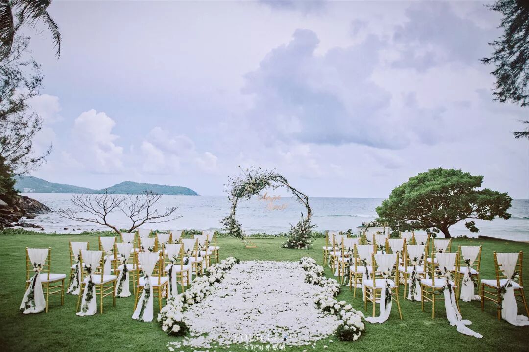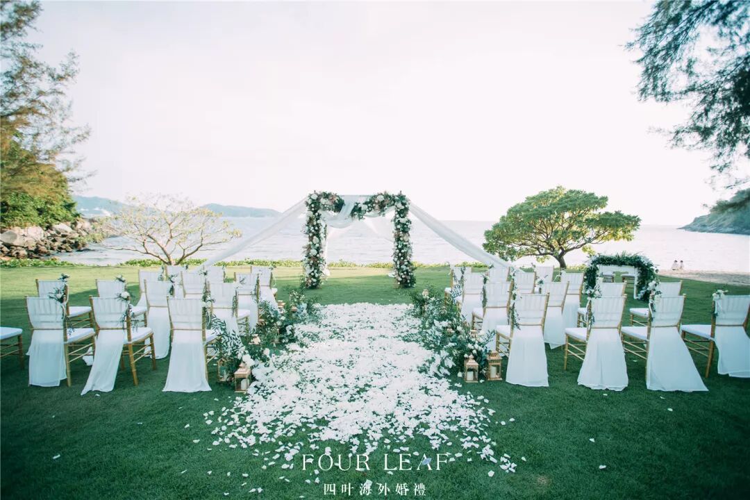 四叶这次为新人选择的普吉岛纳卡草坪婚礼场地,面朝大海,拥有超大面积的草坪,不仅满足120人的宾客,而且可以做定制布置婚礼。
