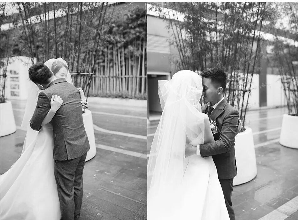 由于时间太过匆忙,等First look开始的时候,大厅已经站满了人,我隔着面纱,透过乌泱泱的人群,一眼看到绷得笔直站着的他,一步一步走向他的时候,不知道是天气太冷还是紧张,整个人忍不住的发抖。