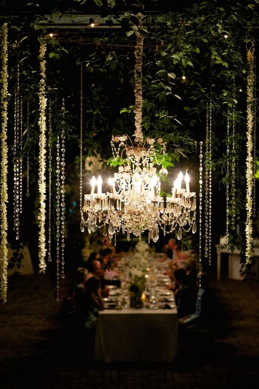 将各种造型的水晶吊灯和串灯挂起来,交相辉映之下,营造出梦幻又大气的婚礼氛围,适用于偏奢华的户外婚礼~