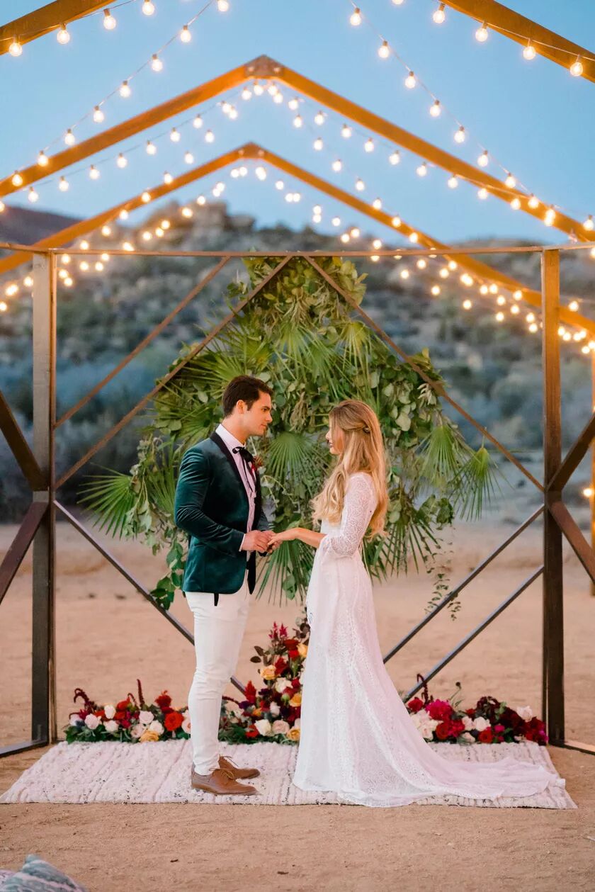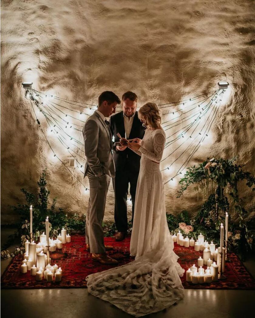 不管是闪烁的檐篷,串灯灯泡勾勒的场景,还是水晶吊灯和滴蜡烛打造的小仪式区,都超级浪漫哦~