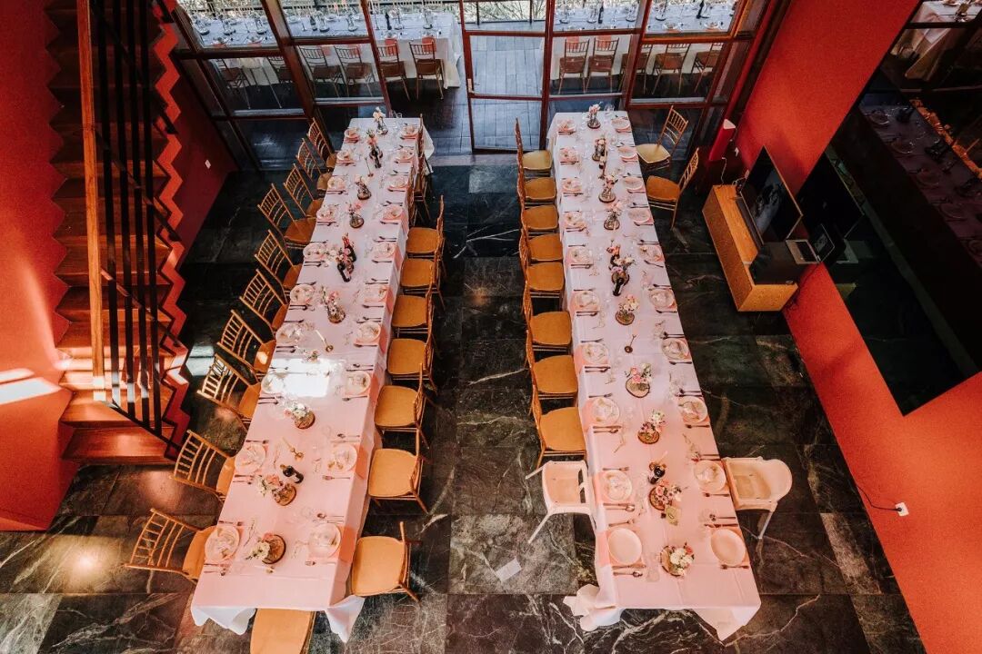 摆台细节感满满,红墙同色系餐巾、长蜡台、硫酸纸菜单。