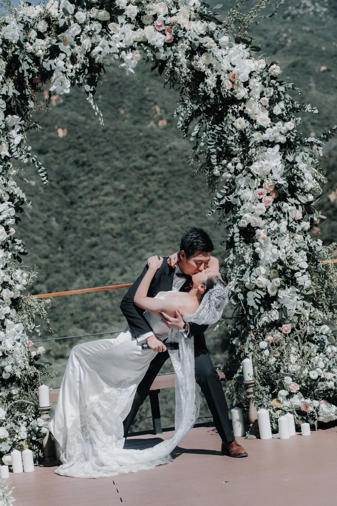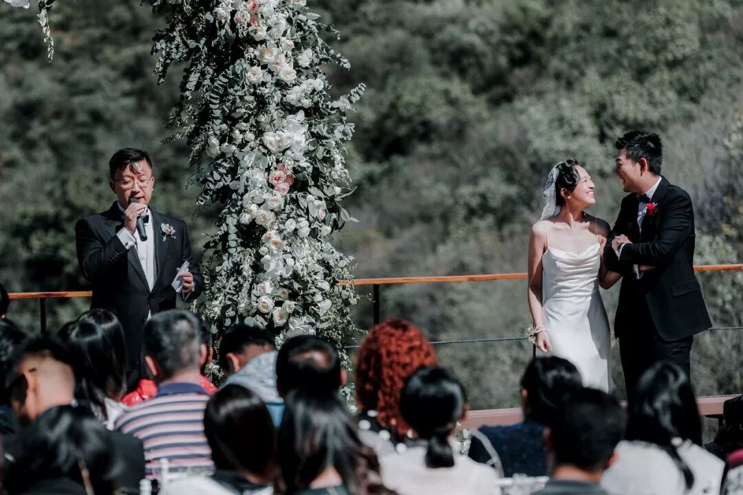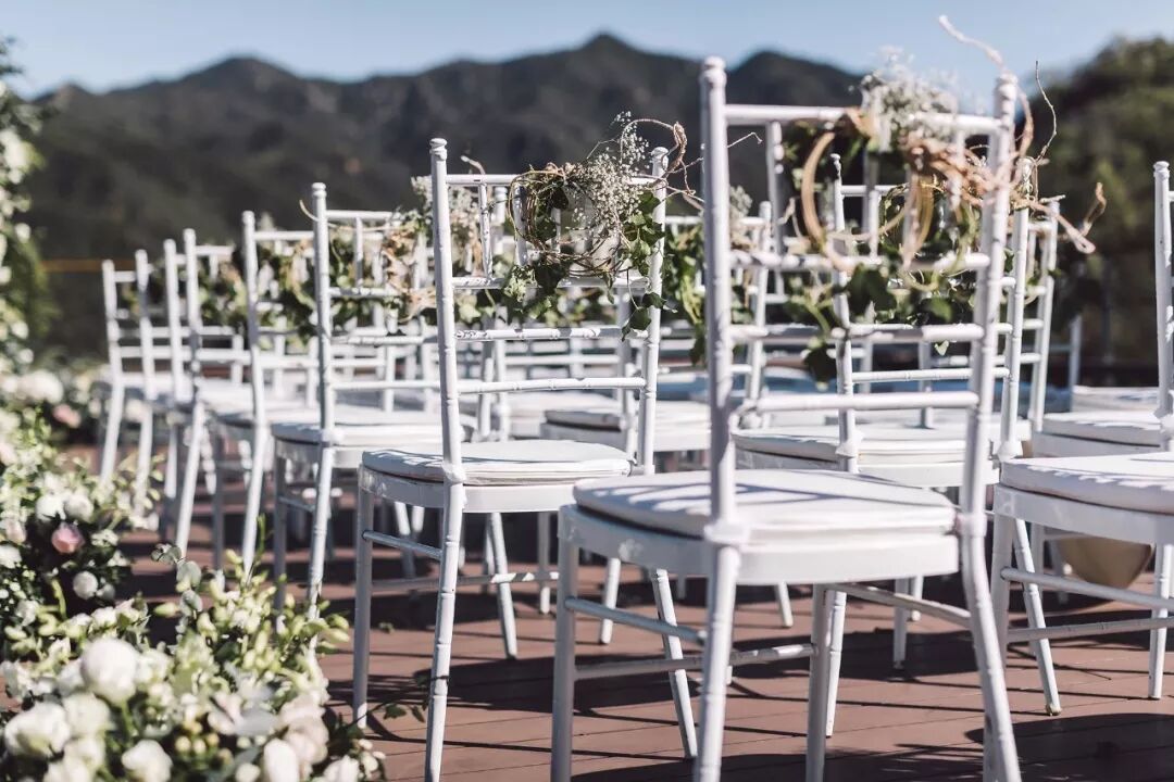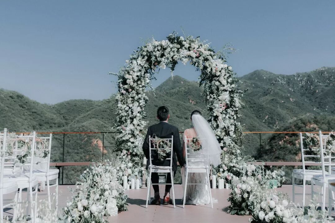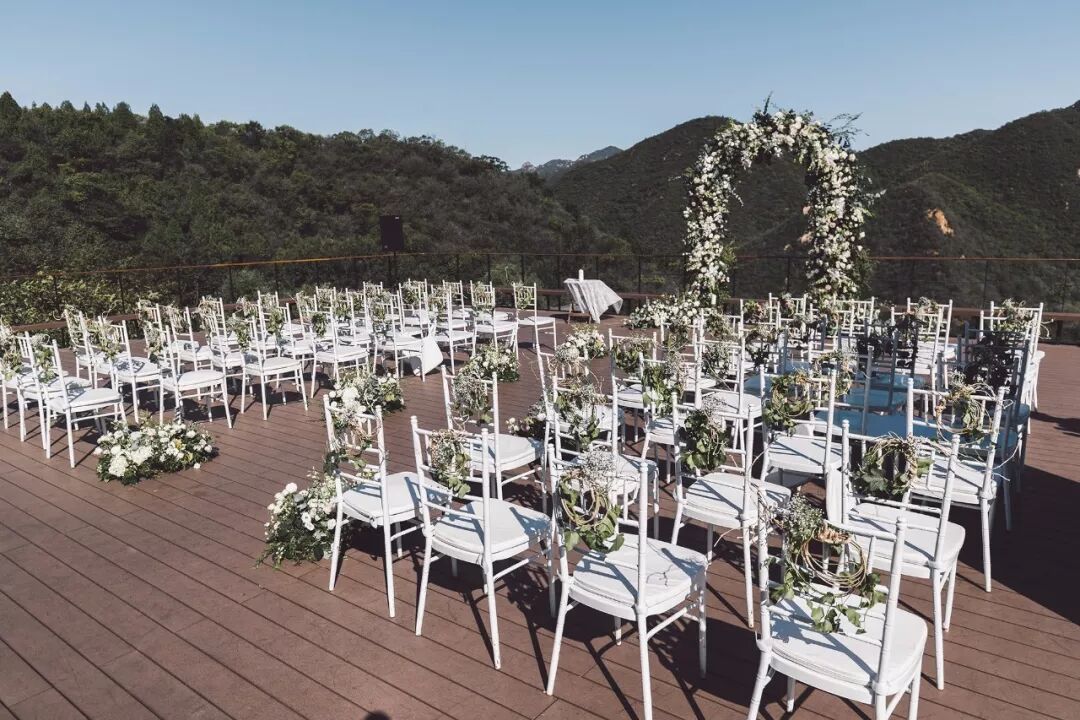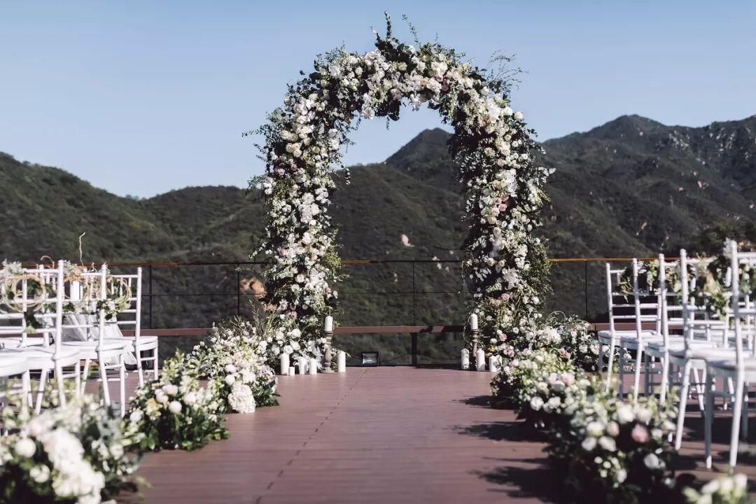 仪式区的经典圆拱门采用了清新的白绿色系,搭配少量淡粉。竹节椅背后的藤制花环装饰与背景群山完美地融为一体。