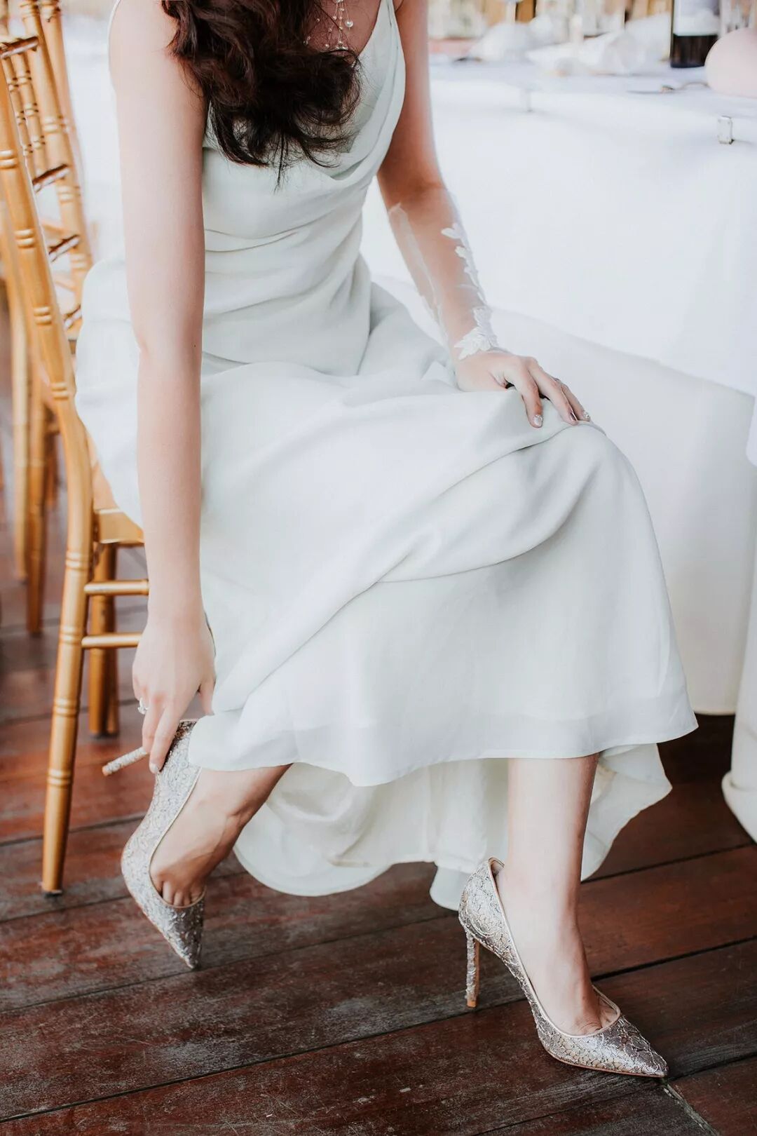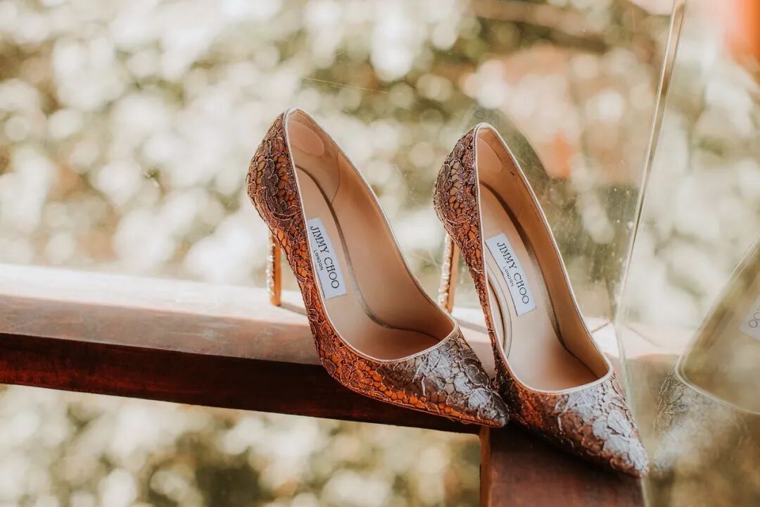 婚鞋不免俗地用了Jimmy Choo,但因为自己不喜欢bling bling设计,所以没有买经典款,而是选了比较少见的金属银线蕾丝款,搭配婚纱和敬酒服都出奇地合适。