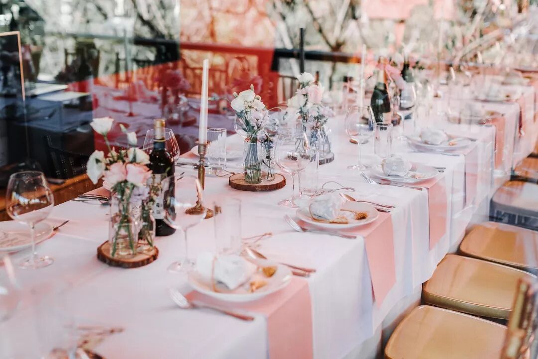 午宴区的桌花是粉白色系,完美搭配红房子本身低饱和度的莫兰迪砖红色。