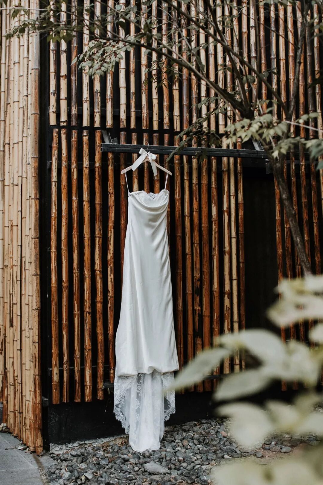 正式的婚纱我整场只用了一件,但也是在各种比较后自己唯一最喜欢的一款。丝质垂感吊带长裙, 前面是简单的褶纹设计,小摆尾有小面积的蕾丝装饰。