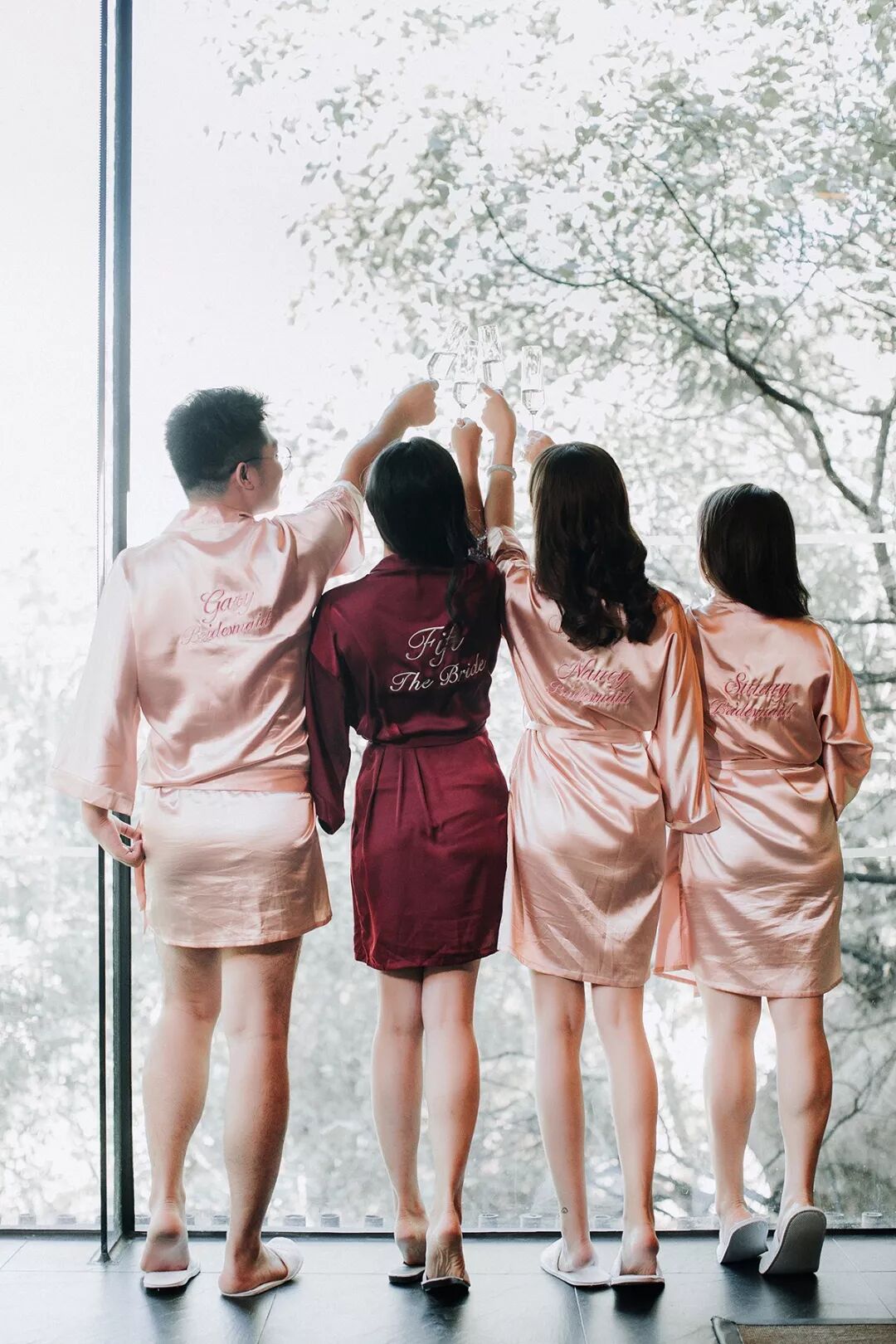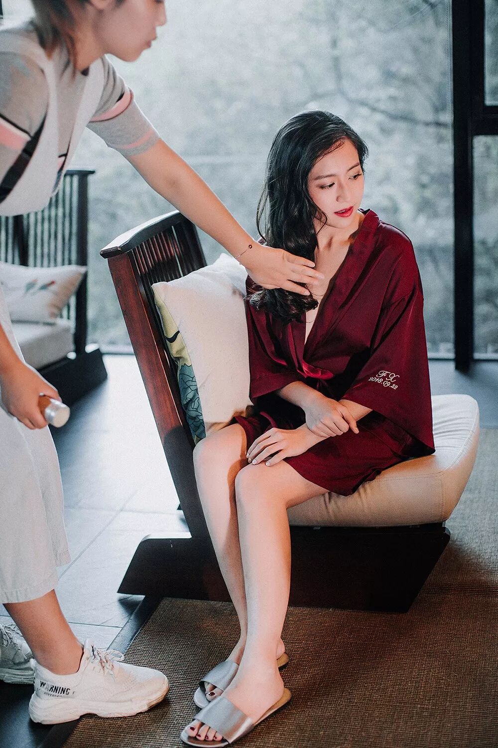 晨袍照就在前一晚入住的竹屋中拍摄,算是见缝插针地安排了些许中式环境元素。每件晨袍都特别定制了每位伴娘的名字,婚礼的logo及日期。