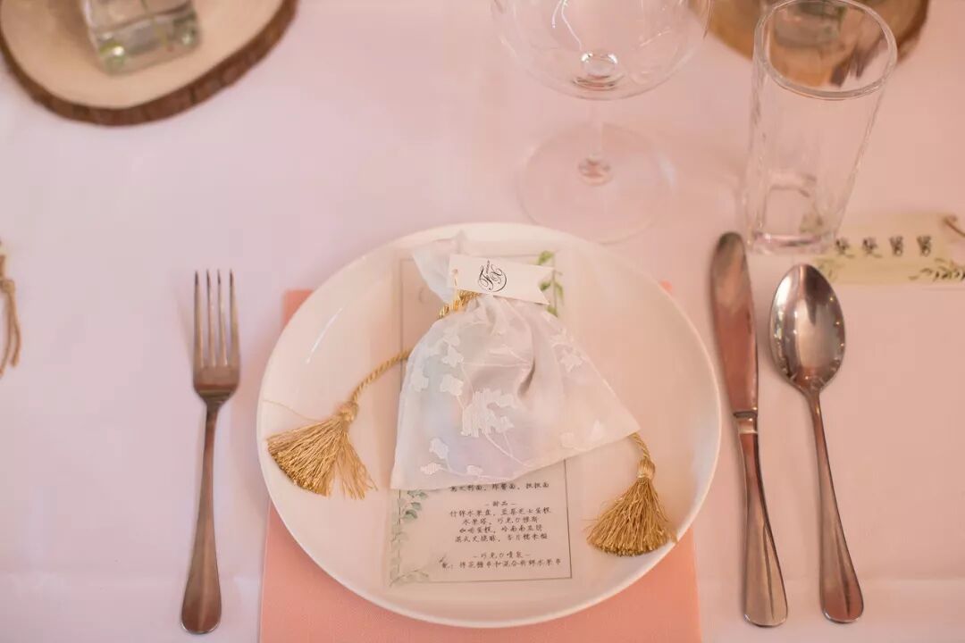 挂有婚礼logo的白蕾丝喜糖袋,清新田园风格的宾客名卡及桌卡。
