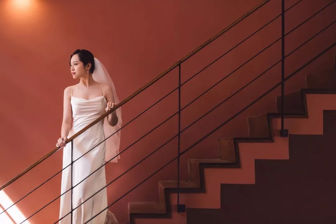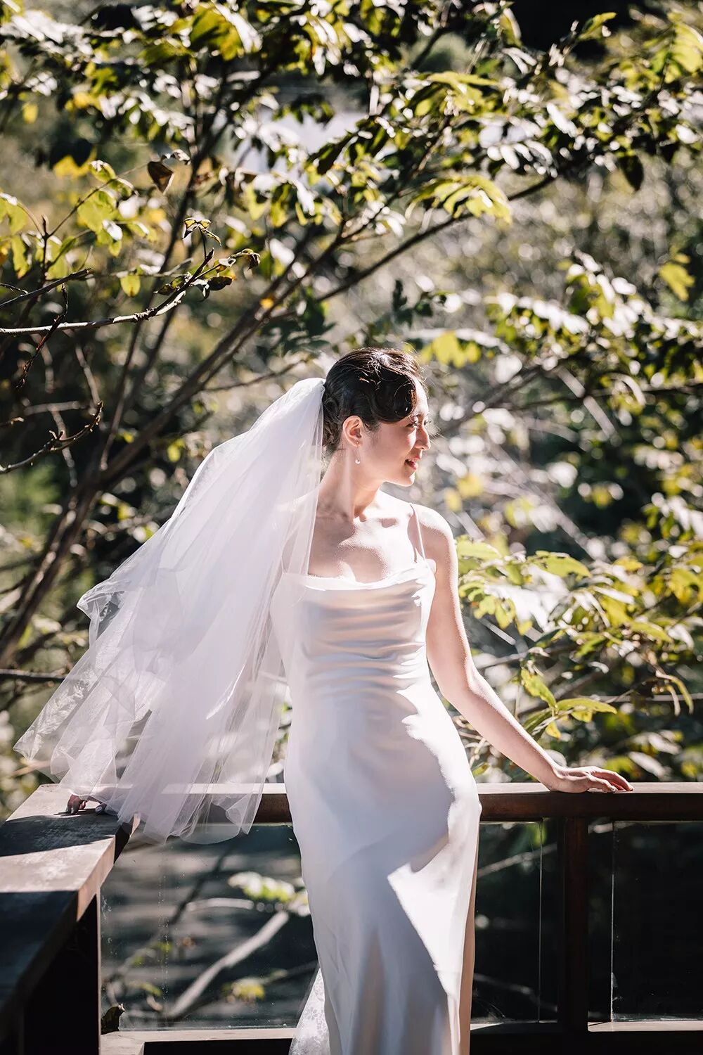 为了区分仪式前的拍照look和仪式间look,我用了两款头纱,拍照时低戴经典的齐臀纱。