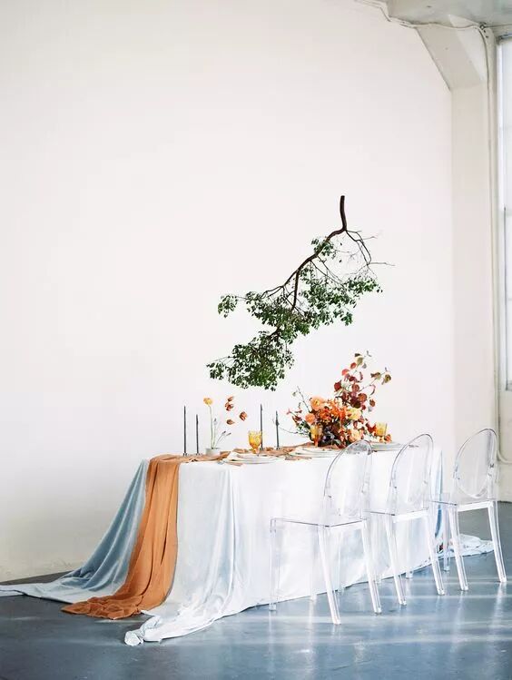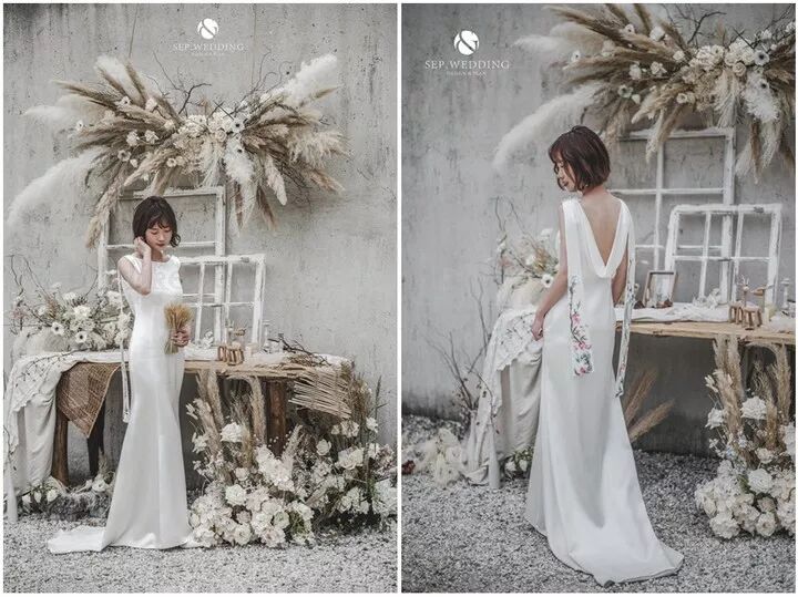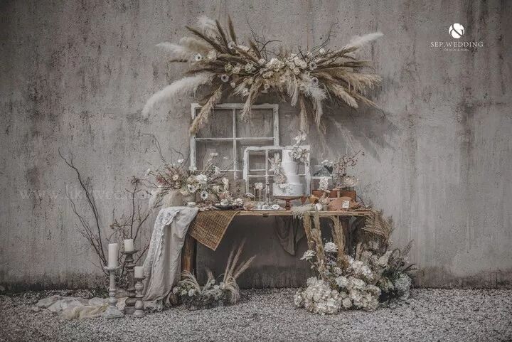 当然,这也比较考验婚礼花艺师的水平。很多冬季婚礼中也常常会用一些干花材来实现极简,选用一些类似于蒲苇,枯枝来修饰,既有那种时间沉淀的沧桑感,也显得独具一格。