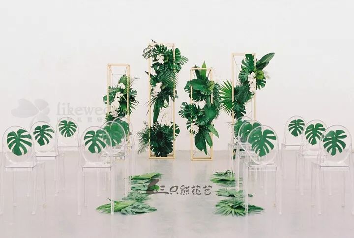 现在越来越多的极简风婚礼喜欢用纯粹的叶材来装饰,不管是仪式区还是宴会区都呈现出干净清新的感觉。