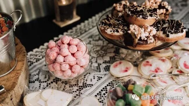 甜点也很丰富,包括有“吃素食吧”字样的翻糖饼干,一面史密斯甜甜圈墙,一台霜淇淋机,乔吉设计的“自己来装”棒棒糖袋,各种素食饮料,还有一个咖啡车,不过上面只有植物奶,比如豆奶、杏仁奶、燕麦奶等。除此之外,还有一个美味的两层香草草莓奶酪蛋糕,里面有五层内霜。
