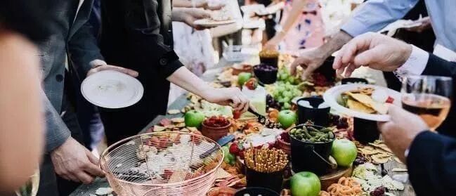 婚礼上美味的素食菜单包括鸡肉点心、鸡蛋培根卷、蒜蓉面包、木火羊肉披萨、凯撒沙拉、鸡肉沙丁鱼、辣芝士薯条、墨西哥玉米片,还有一张硕大的放牧桌(甜品桌),摆满了素食奶酪和小食。
