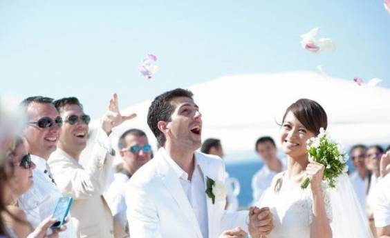 ▲梁咏琪和老公Sergio在西班牙伊比萨岛完婚,接受亲友撒花祝福。