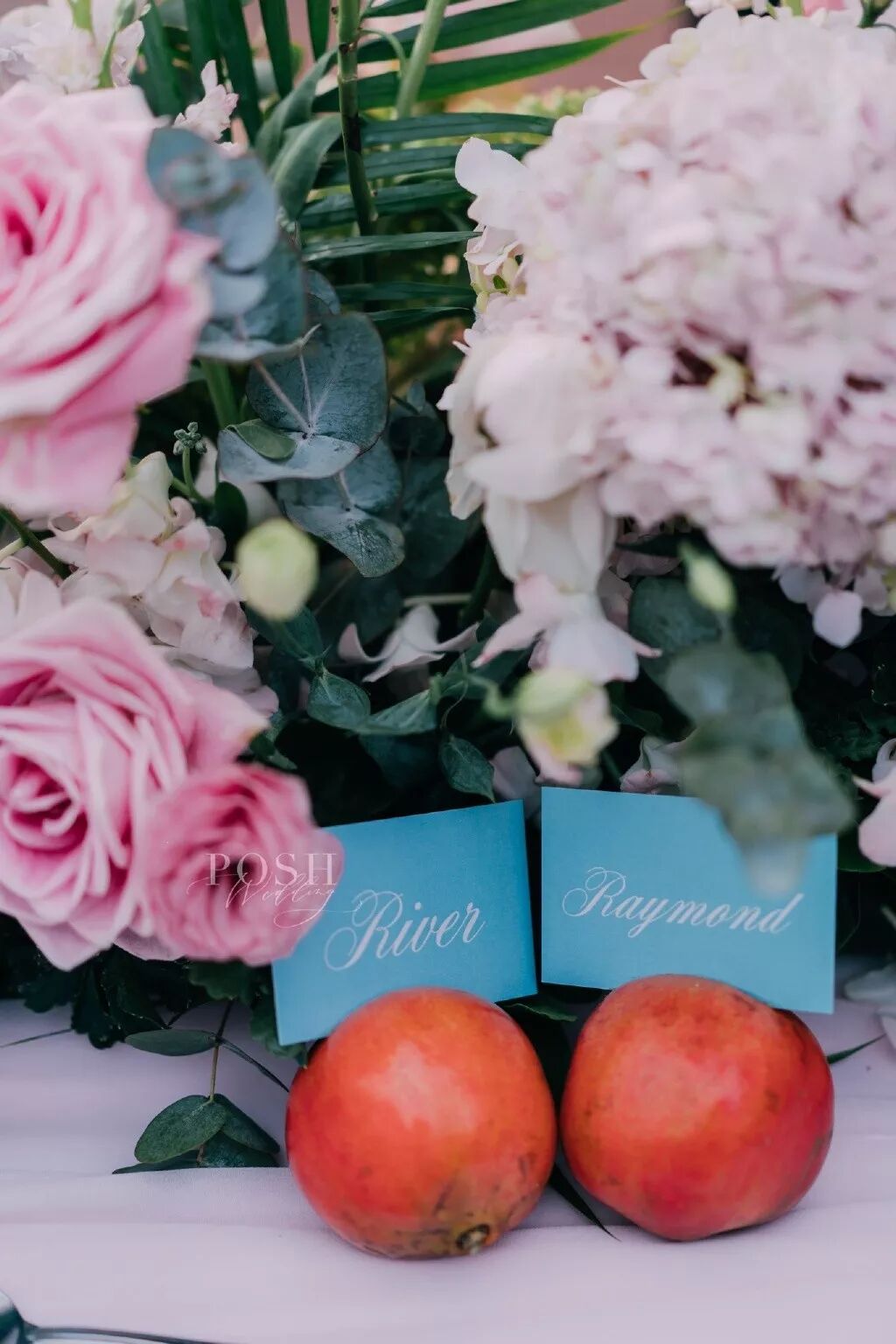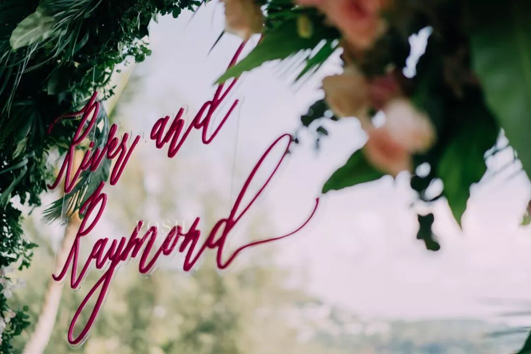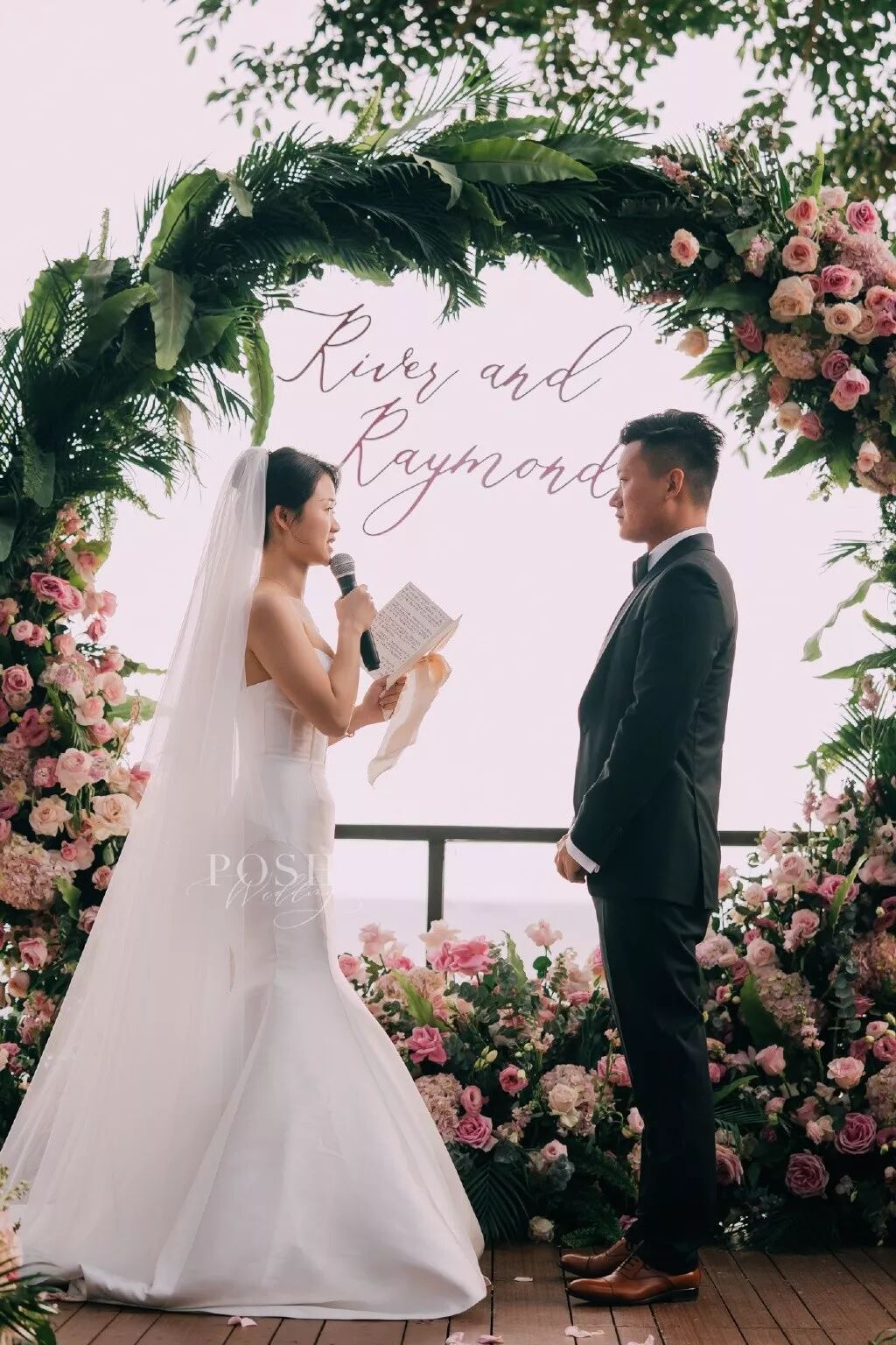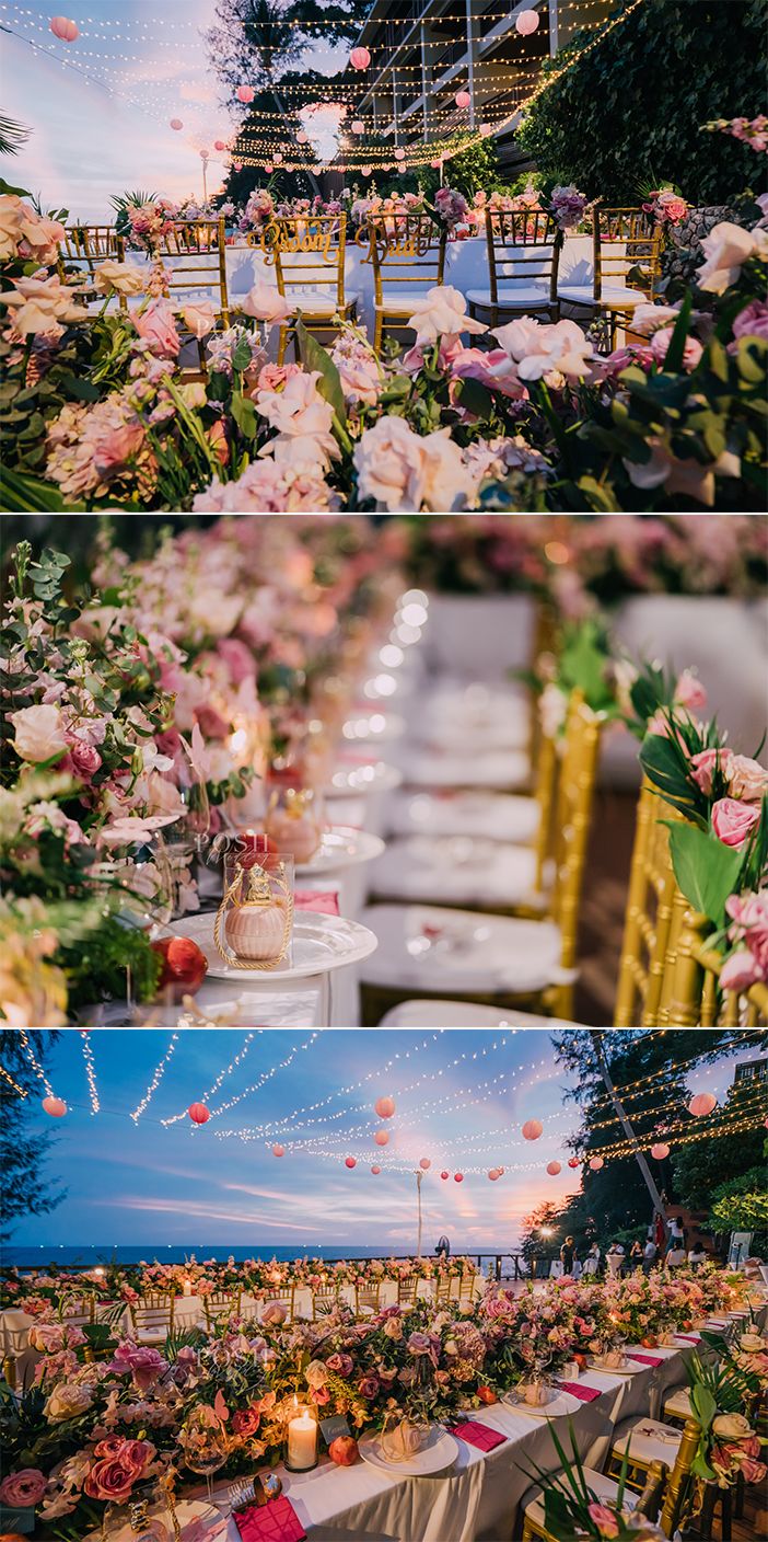 冒险相联想到的就是粉红的热带风格,所以婚宴采用大量的粉红色与绿色花艺,让整场婚礼之身于热带雨林的豪华盛宴。
