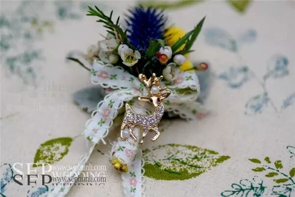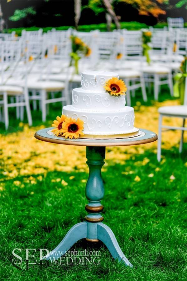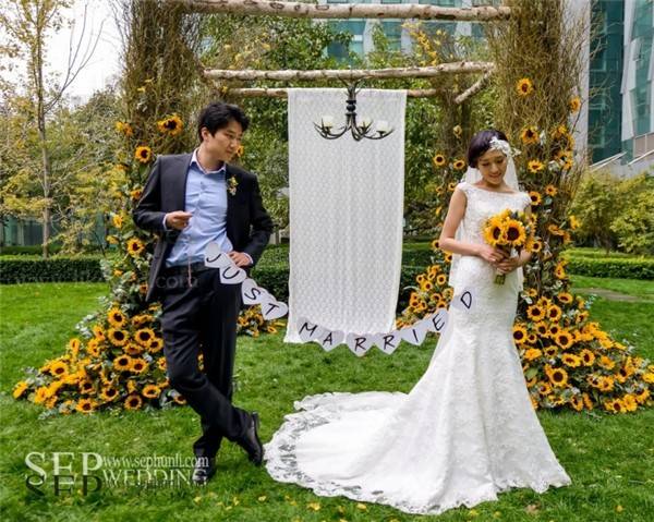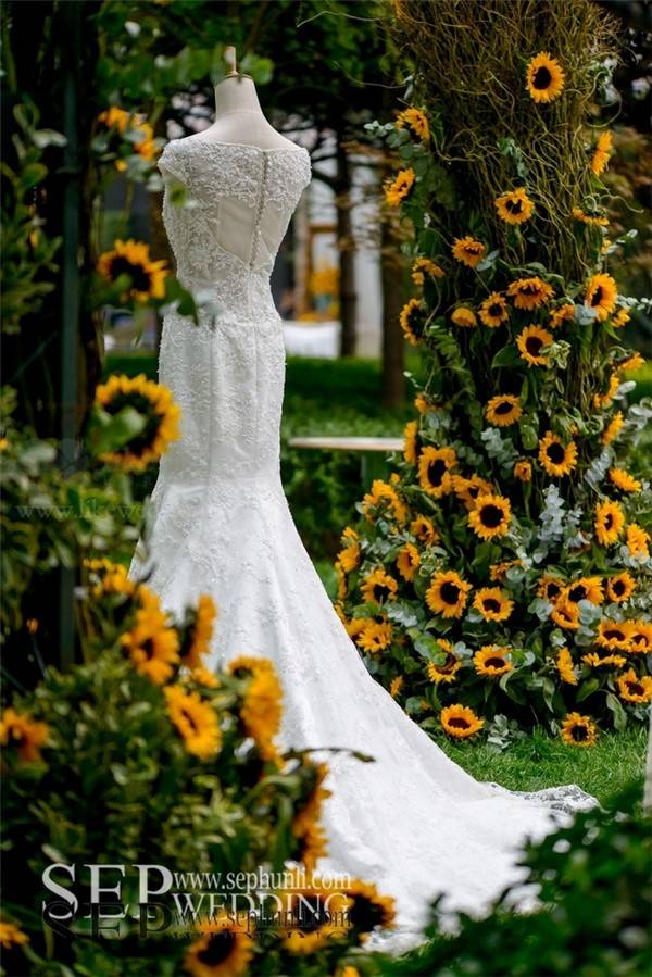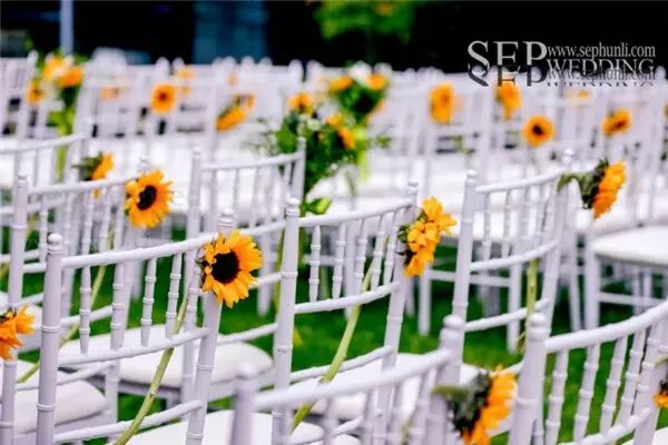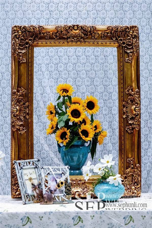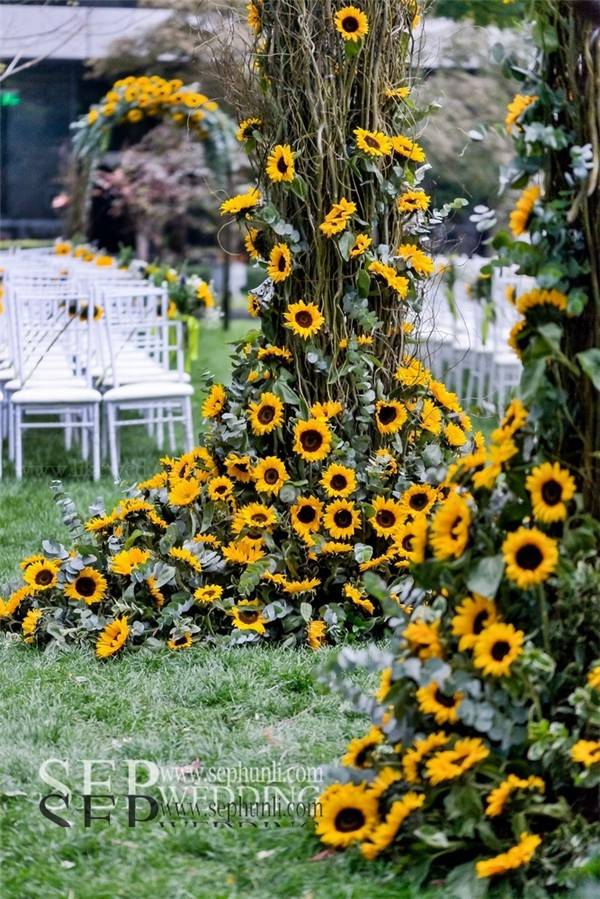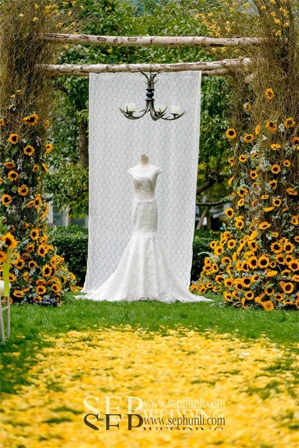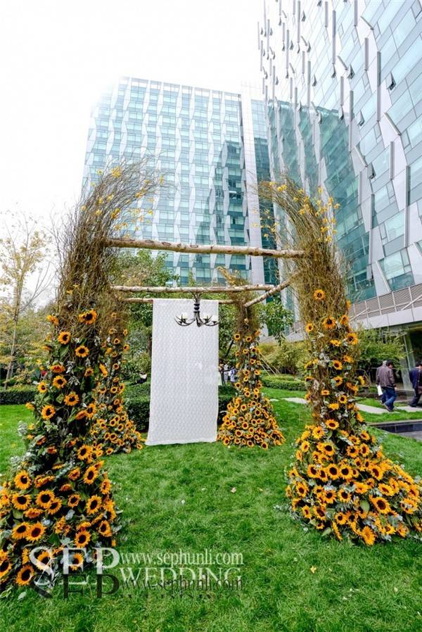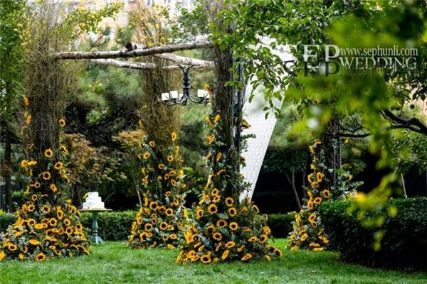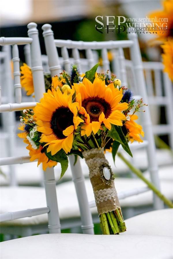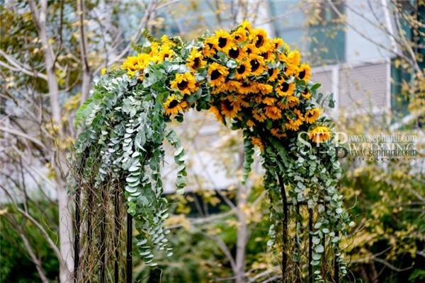 向日葵这种花材由于它太过夺目,很难与其他花材搭配。用大量龙柳的枝条来体现自然和丛林的感觉。在柔软的白色的蕾丝背景前,这些精致,很好的补充了向日葵原本的粗糙感。