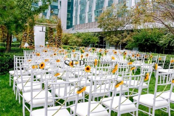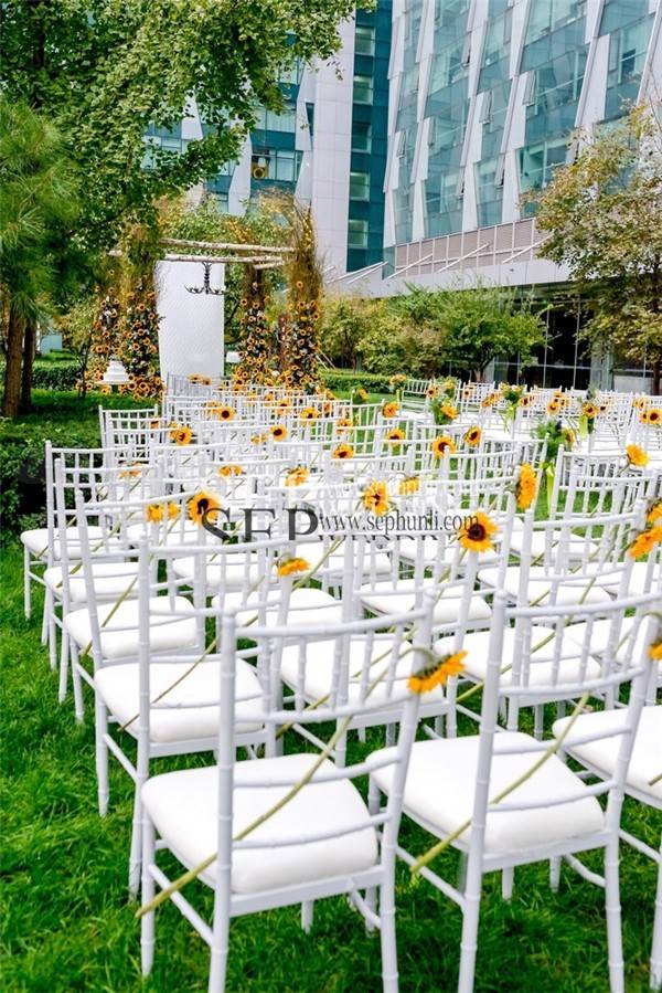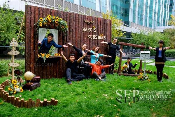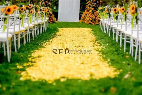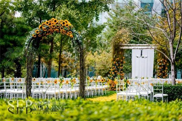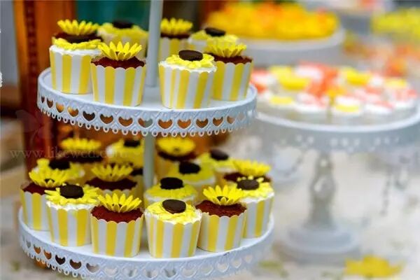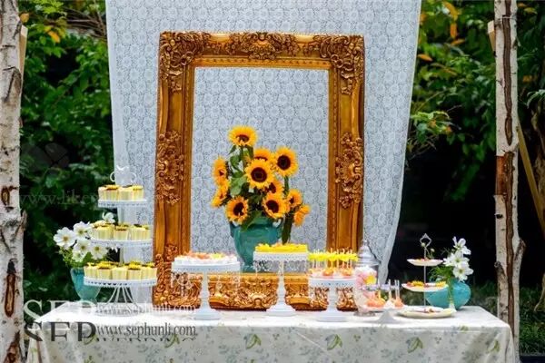 甜品台背景的设计的灵感来源于梵高的向日葵,我们用这种虚实结合的方式来还原那幅著作的感觉。