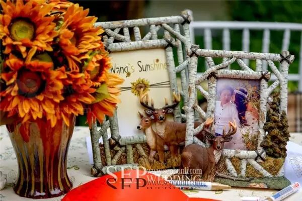 新人曾经有一次难忘的北欧旅行,那种自然原始的风光给他们留下了深刻的记忆。那些欧式的建筑、教堂、装饰、森林、驯鹿、还有小木屋…于是合影墙灵感就是来源于这些记忆的片断…