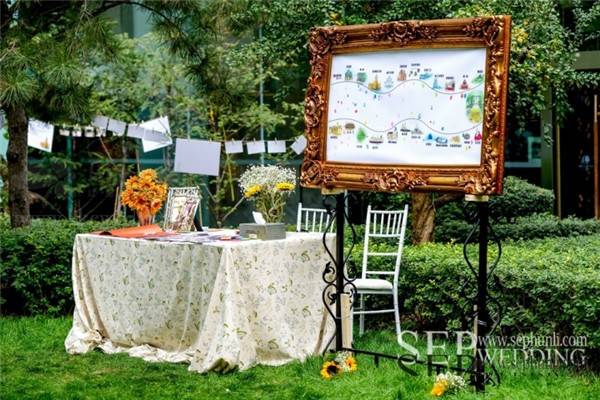 他们一起走过很多地方,于是手绘师将这些地方绘画出来,让来宾用指纹签到的方式一起见证他们一起走过的路,而这条路的终点就是我们的婚礼!