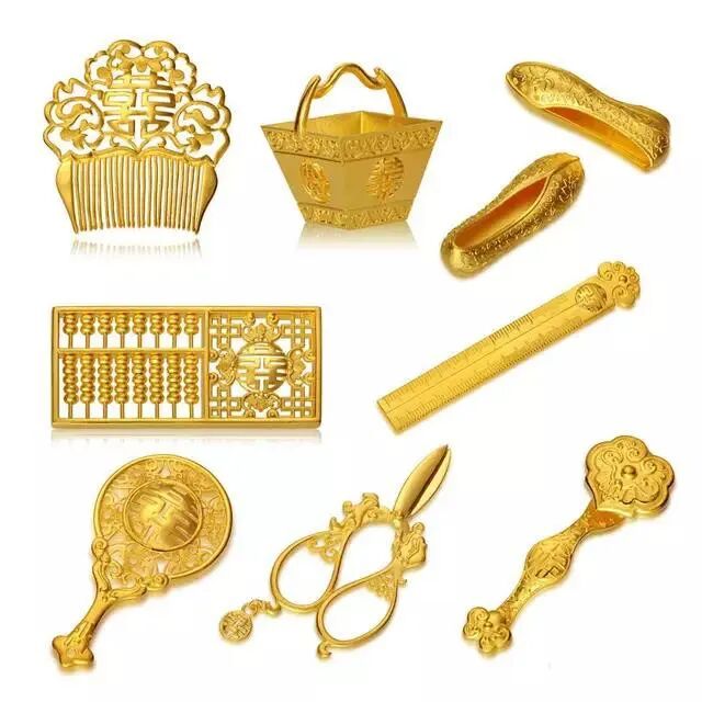 “婚庆九宝”已经不仅仅是一套婚庆的送嫁金饰,更是一种对百年好合,天长地久的寄托、期待与憧憬,是一种满足的幸福感,她所传递的文化理念远远超越了黄金本身的价值。这些小小的传统造型金饰正是甜美生活主题与新古典主义风潮的一种融合。白头偕老的相惜相守,永恒不变的海枯石烂都蕴含在这些小小的信物中,让人将那份最真挚的感情保留在心底。