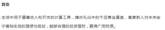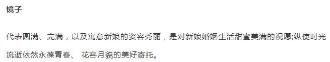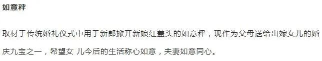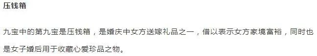 婚庆九宝是结合中国传统婚庆习俗中送嫁或迎娶的礼仪,从中国传统文化精髓中提炼出九个最具代表性的吉祥、富裕寓意的物件,