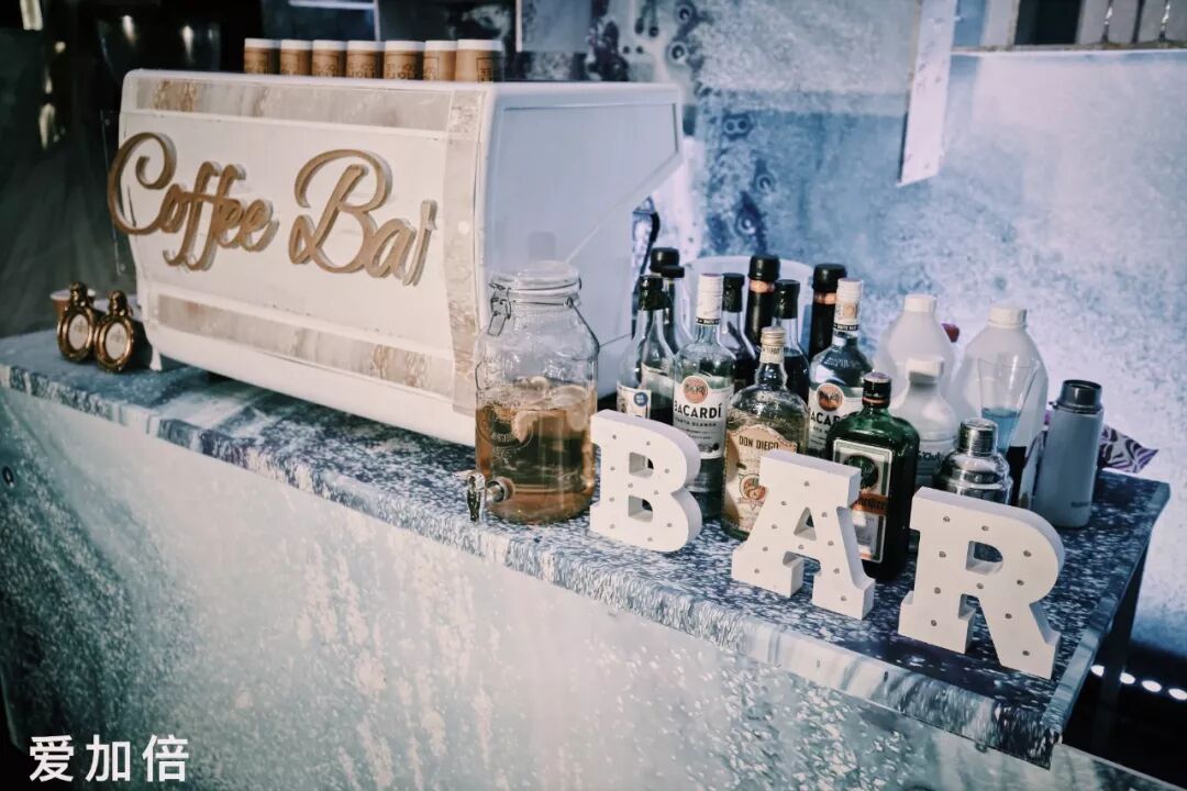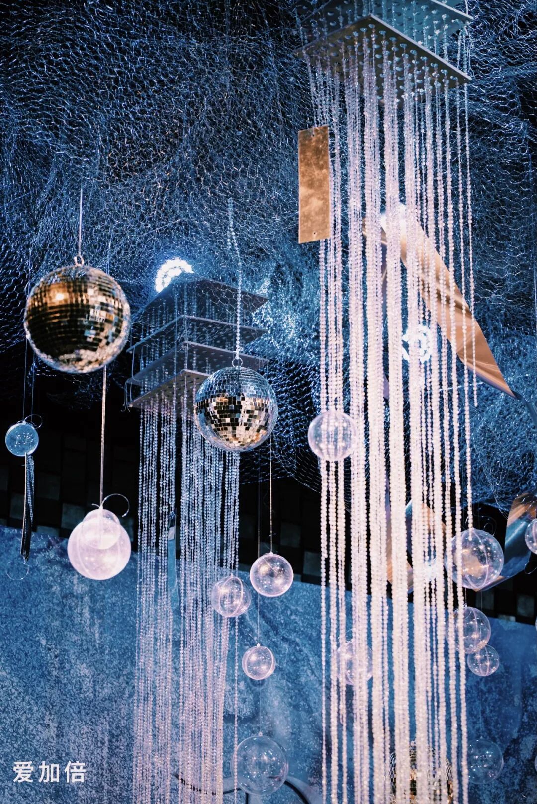 舞台顶部通过珠帘垂吊的视觉感受,来增加婚礼现场的柔软感,珠帘间错落排列着大小不一,不同材质的球形造型,在保证了格调清新,轻奢的基础上,增加了些许小情趣。