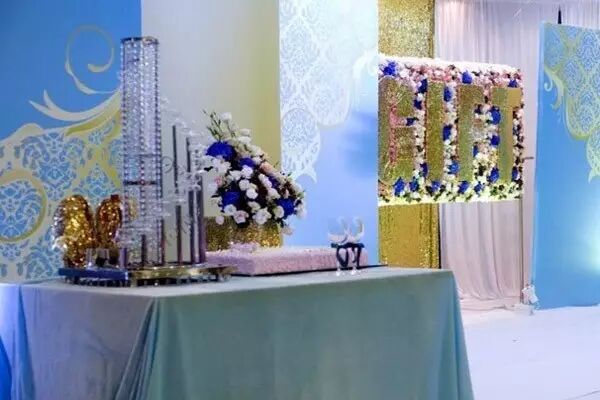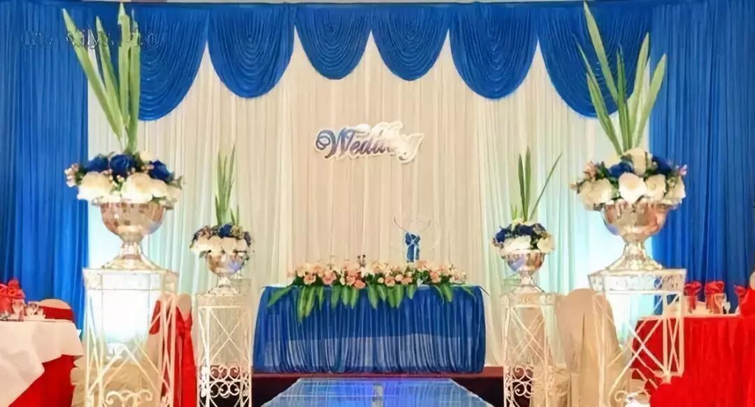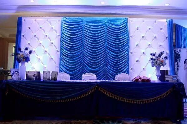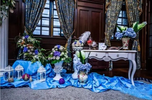 四、在主婚礼大厅两边的各四个柱子之间,用蓝色的薄纱相连,在柱子壁灯映照下更显的温柔迷离,屋顶上装满蓝色的薄纱从舞台处一直与海洋公主的绣房纱亭相连,纱亭里吊椅上就是今天最幸福的新娘。