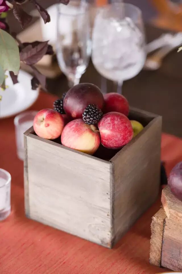 将苹果和黑莓装在小木箱里,在桌面上创造出一种乡村的感觉。