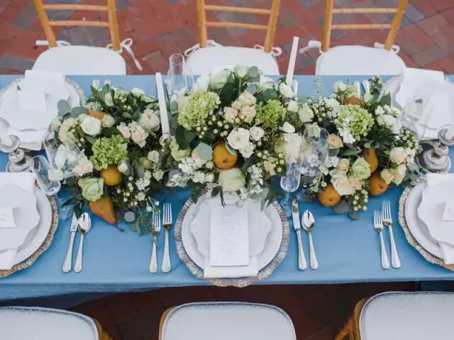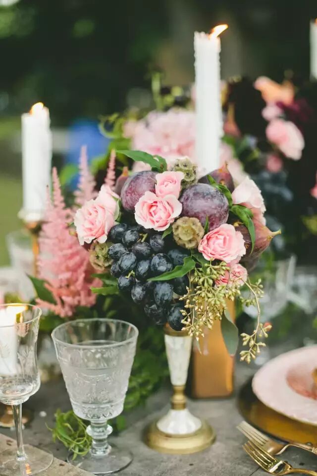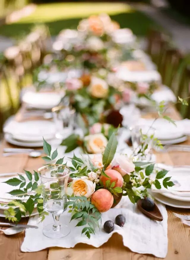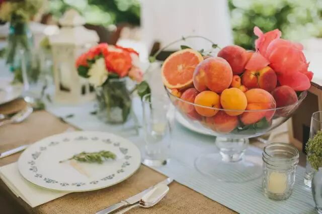 这两种类型的新娘似乎都有自己的道理。当与郁郁葱葱的鲜花搭配,新鲜的水果可以丰富婚礼中心的自然设计,捕捉每一朵花的美丽。例如,在栀子花里加入多汁的桃子可以增强这种花的南方魅力。水果也可以增加纹理和加强颜色,无论是通过分层、对比或与花瓣的色调混合。石榴、浆果和樱桃可以与红色和紫红色的玫瑰搭配,营造出浪漫的色调,或者用鲜艳的酸橙装饰向日葵,看起来活泼生动。鲜花和水果是一对充满活力的组合,它们可以通过混合的方式提升感官,水果也能唤起令人兴奋的味觉。