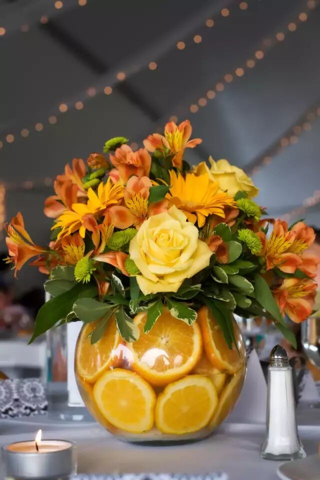 黄色的玫瑰和金盏花、雏菊点缀在一个装满桔子片的花瓶上,这个明亮的中心装饰品给餐桌带来了活力。