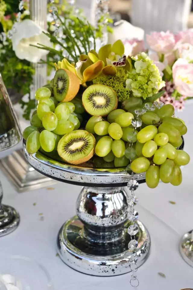 我们在这个漂亮的中心装饰品上看到了绿色。半截猕猴桃和多汁的葡萄串点缀着一串水晶,放在一个破旧的银底座上。
