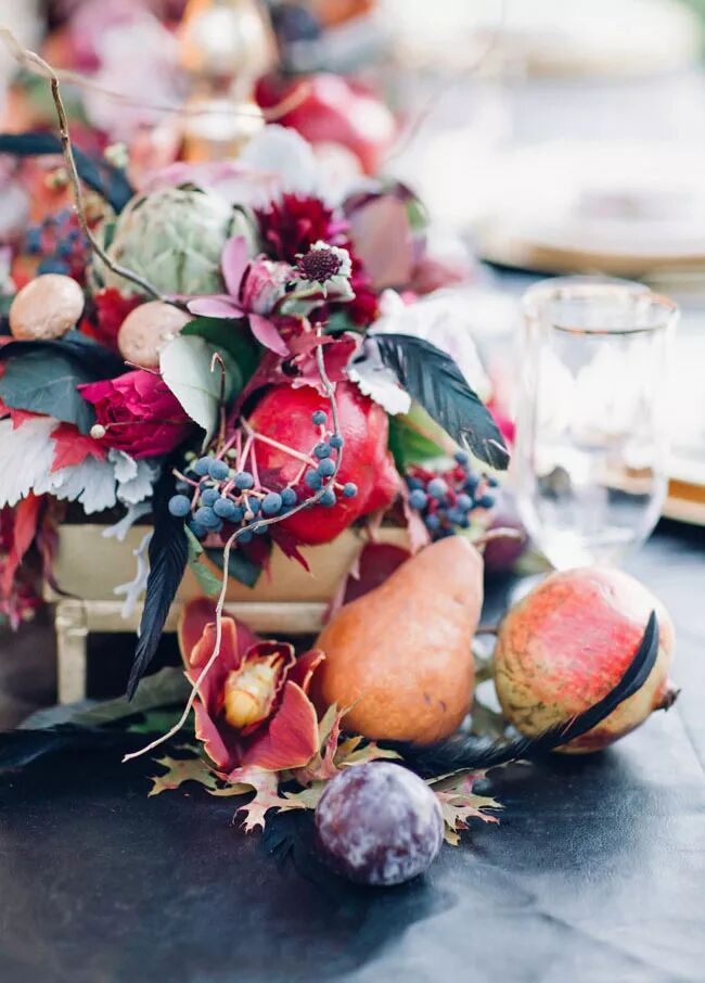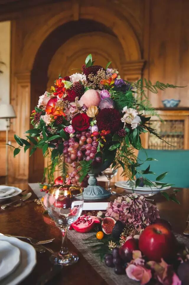 石榴、无花果、苹果、李子、酸橙和蔓越莓会给人一种奢华的感觉,尤其是配以绣球花、大丽花、小苍兰、芸苔草、百合和玫瑰。深紫色,深绿色,红色的风格和配色方案,富有维多利亚时代的感觉。