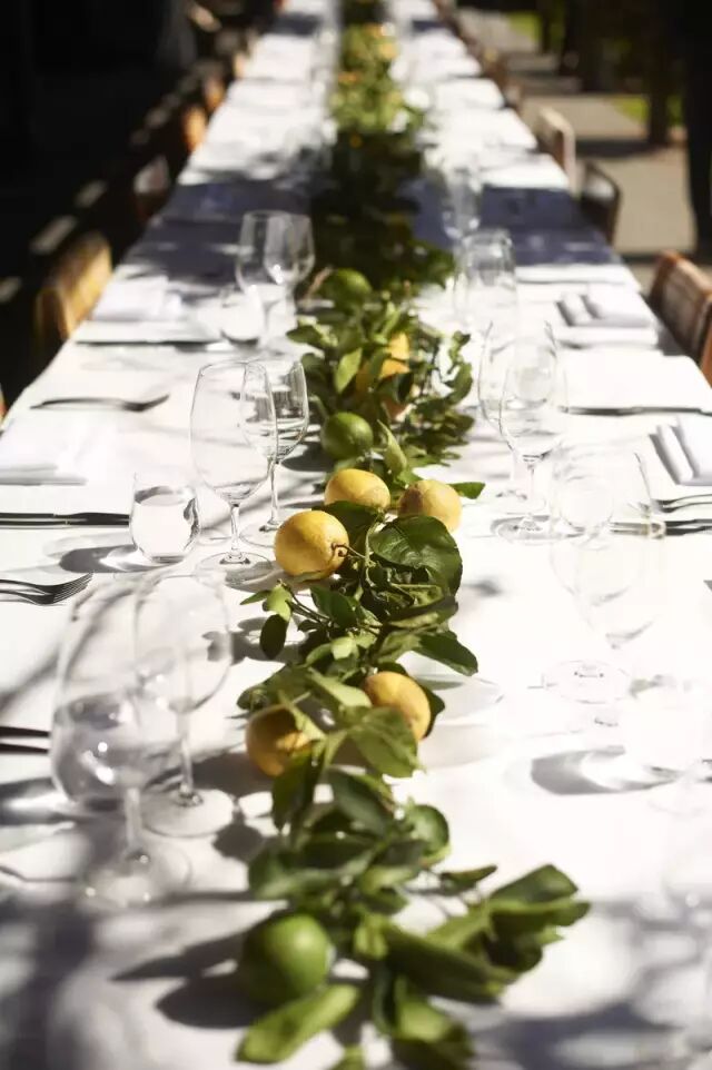 一串柠檬串在桌子中间,撞在白色的桌子上,产生了托斯卡纳的感觉。