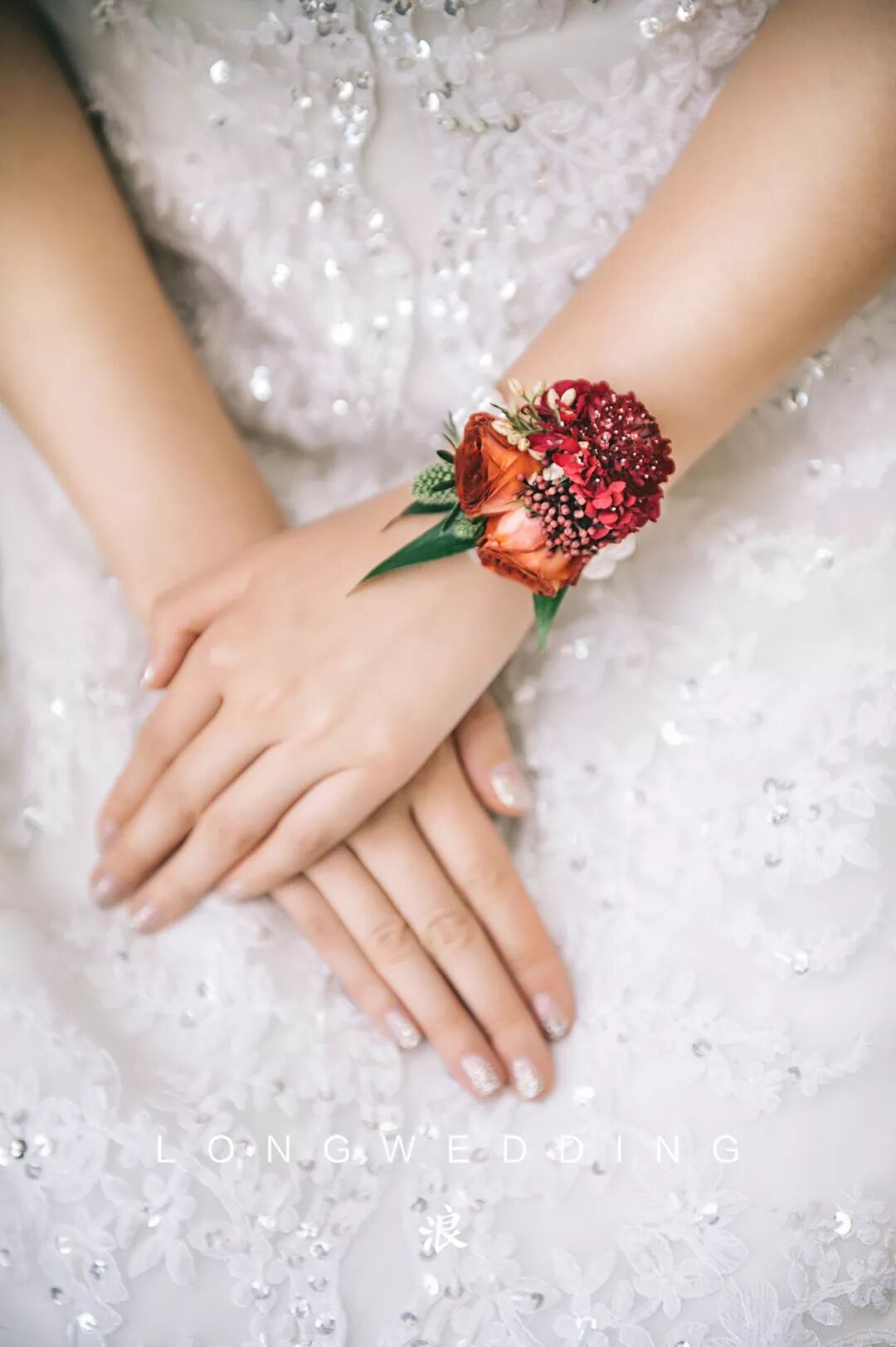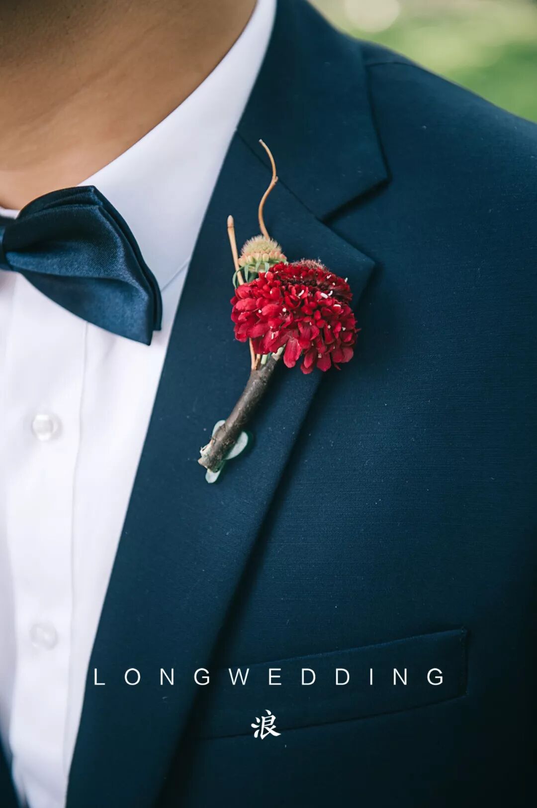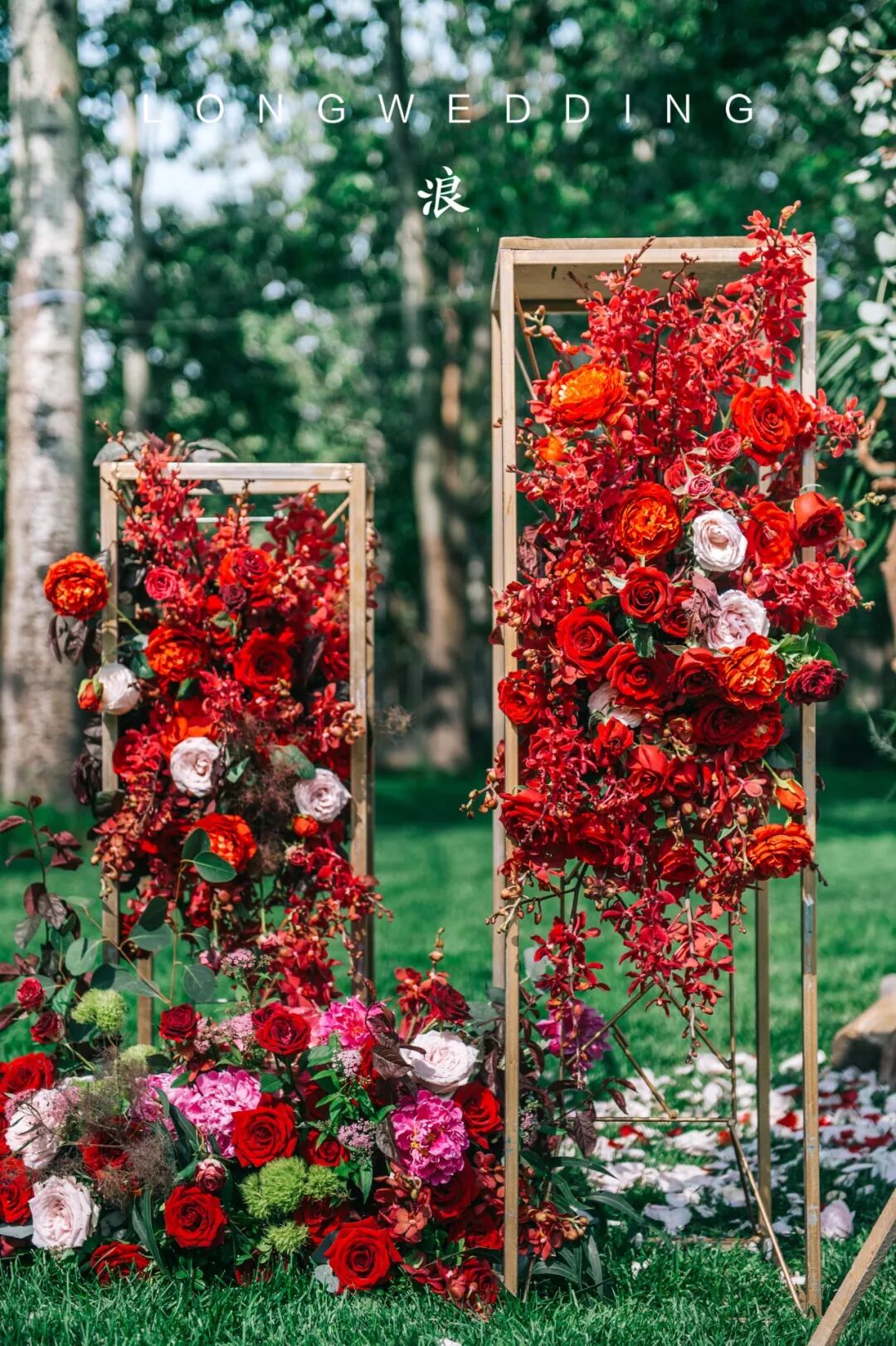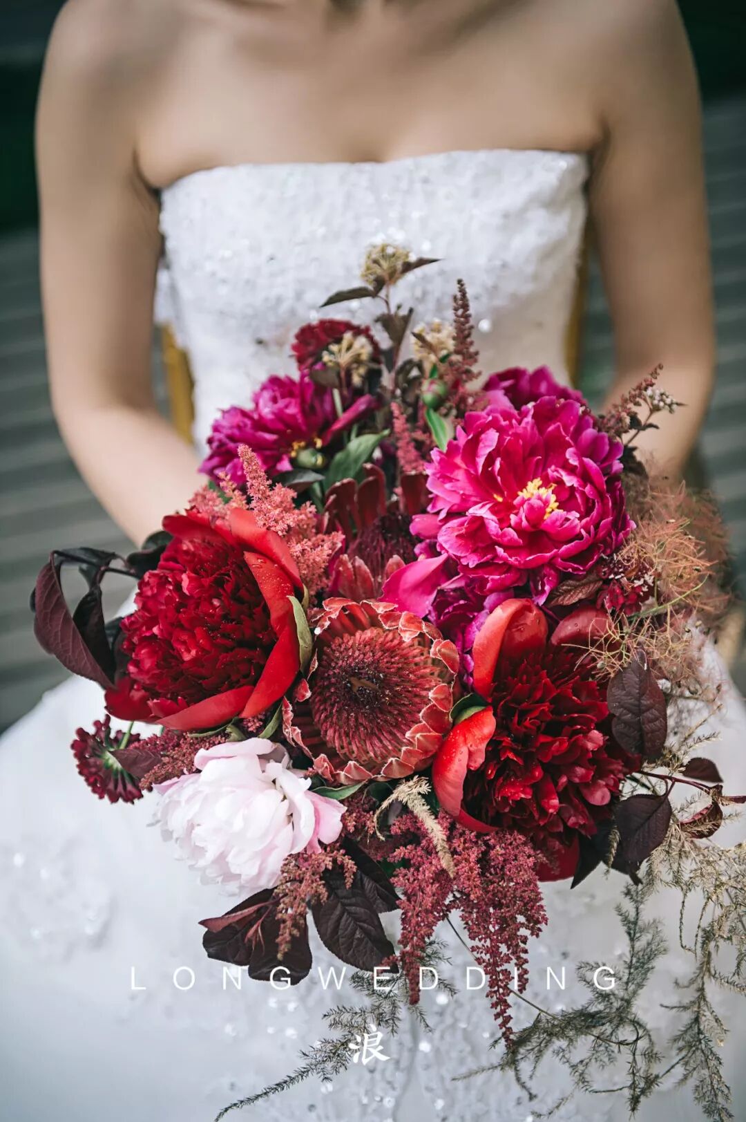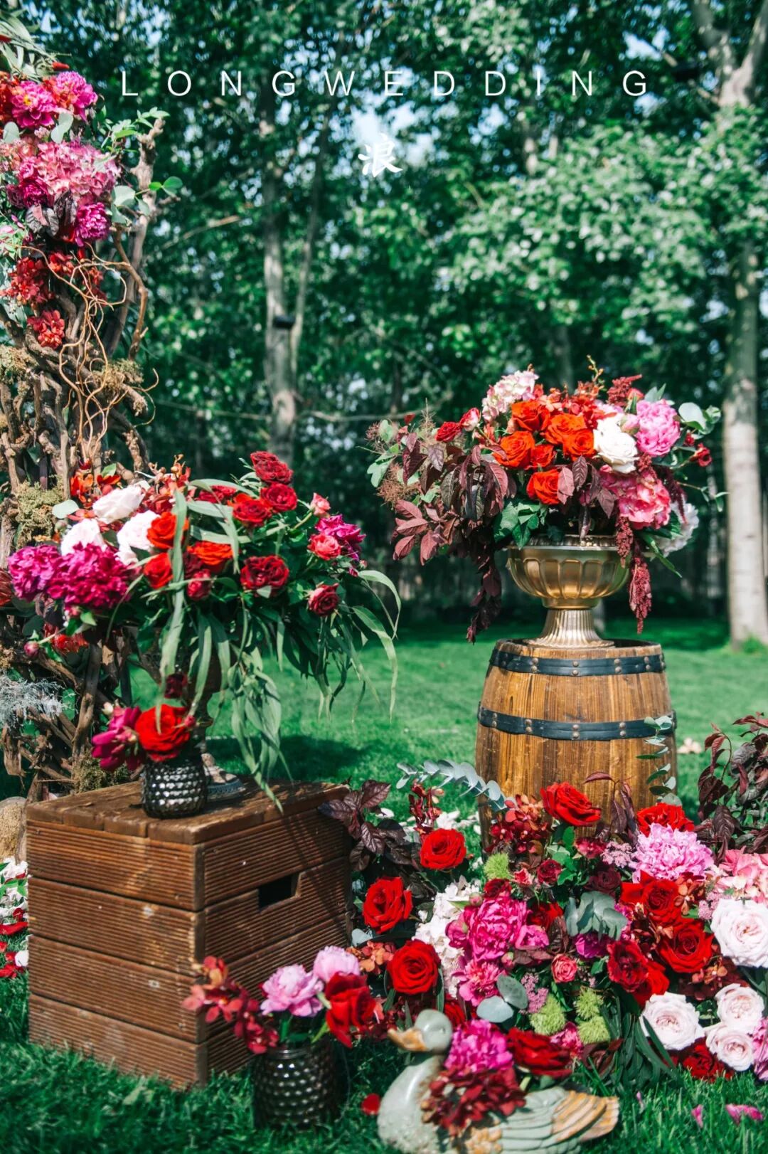花艺的色系选择了红酒的颜色做为主调,再调以各种明度的红,搭配出红色的层次,红的艳丽但不单一。