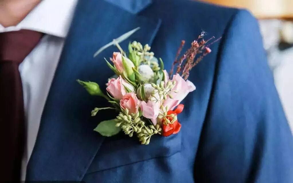 胸花作为的装饰既能提升新郎的魅力,同时也不会显得太张扬。