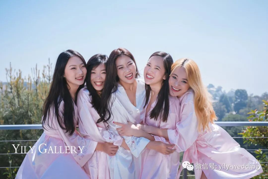 新娘和伴娘们穿着精心准备的晨袍做一些有爱的互动