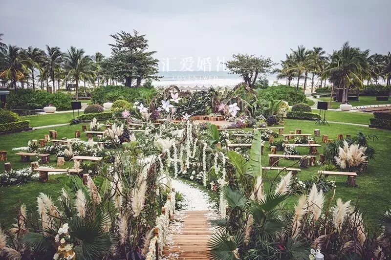 其优点是,在天然的草坪和植被基础上做婚礼装饰,会达到事半功倍的效果,此外,也省去了舞美灯光设备的开销。
