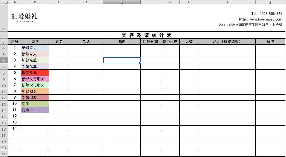 在这里,可以给大家提供一份宾客名单分类表,供大家参考