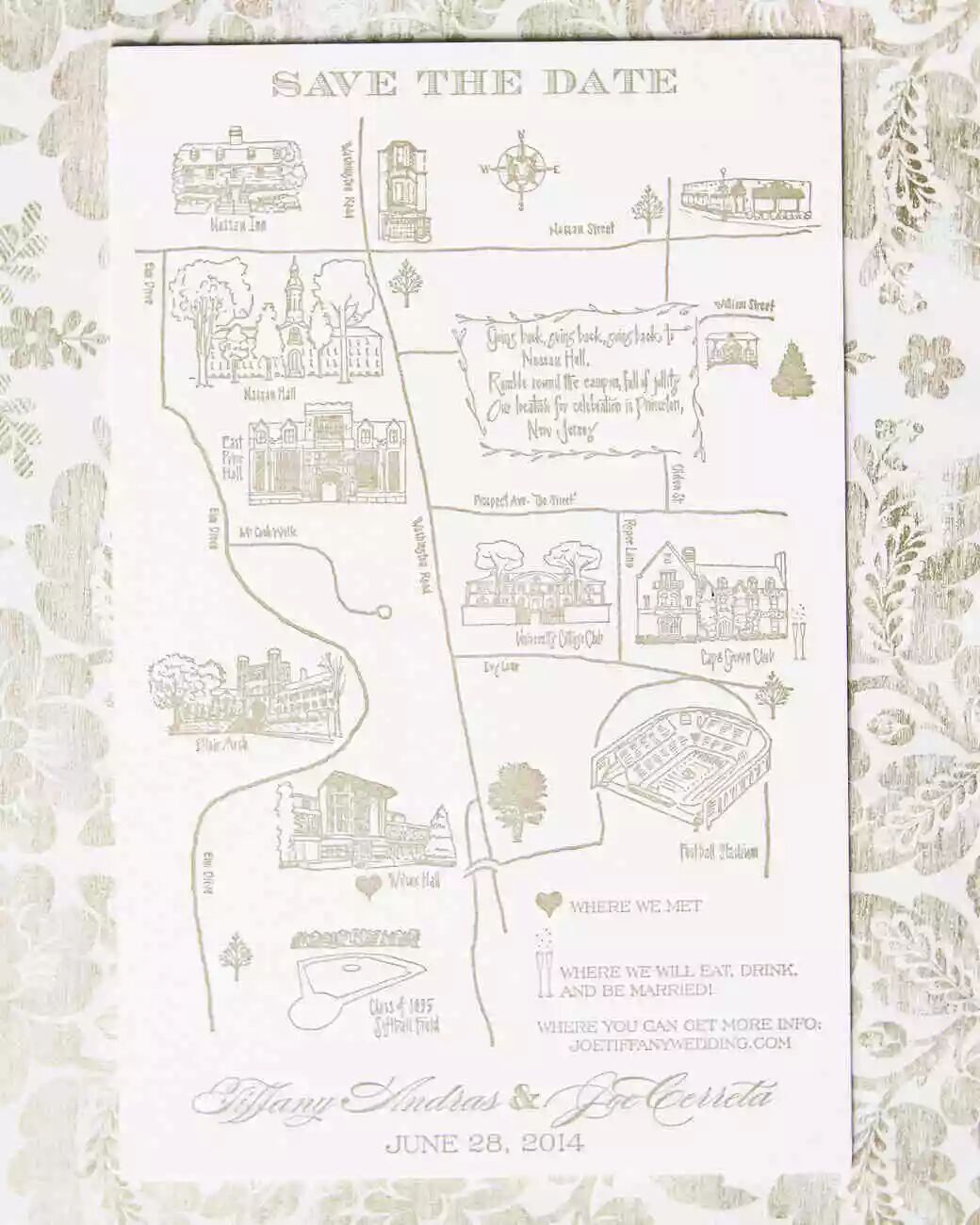 一位艺术家勾勒出这对夫妇的母校(普林斯顿)的地图,其中包括他们最喜欢的地方和地标。其中,还包括两个重要的地方———他们遇到的地方,以及他们在哪里决定共结连理。