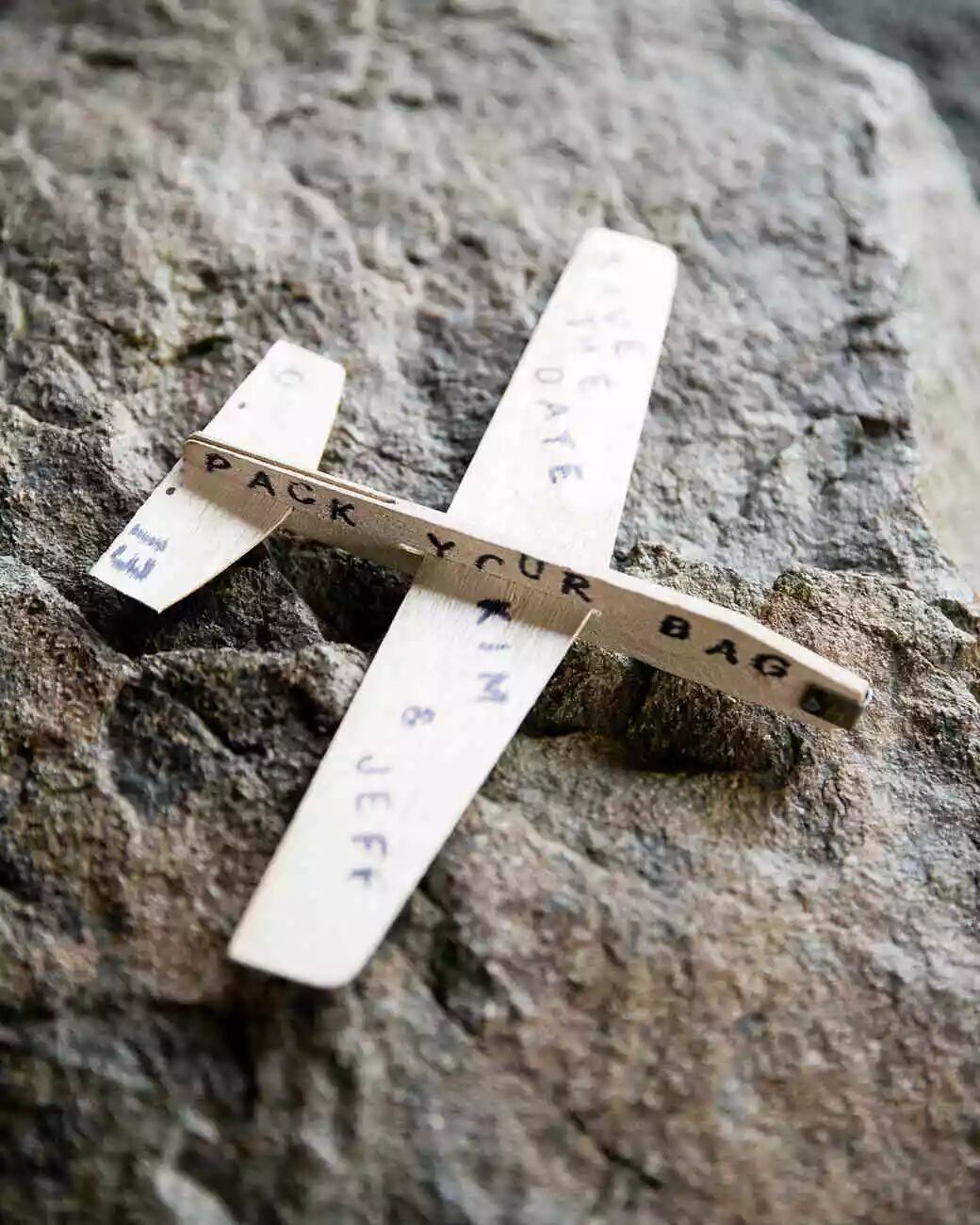 由于新郎在空军服役,这对夫妇决定使用小型木制飞机作为最好的邀请物。机翼上写着夫妻的名字,机身上喊客人收拾好行囊,也算是别样的浪漫。