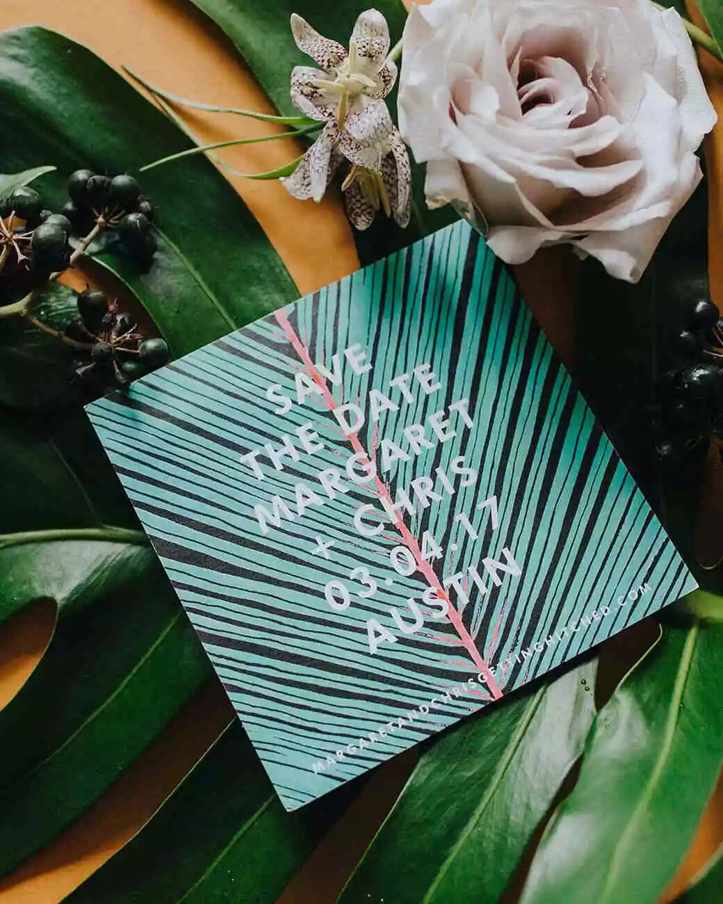 棕榈叶样式的印刷小卡是目的地婚礼保存日期的完美背景,扑面而来的热带风情。
