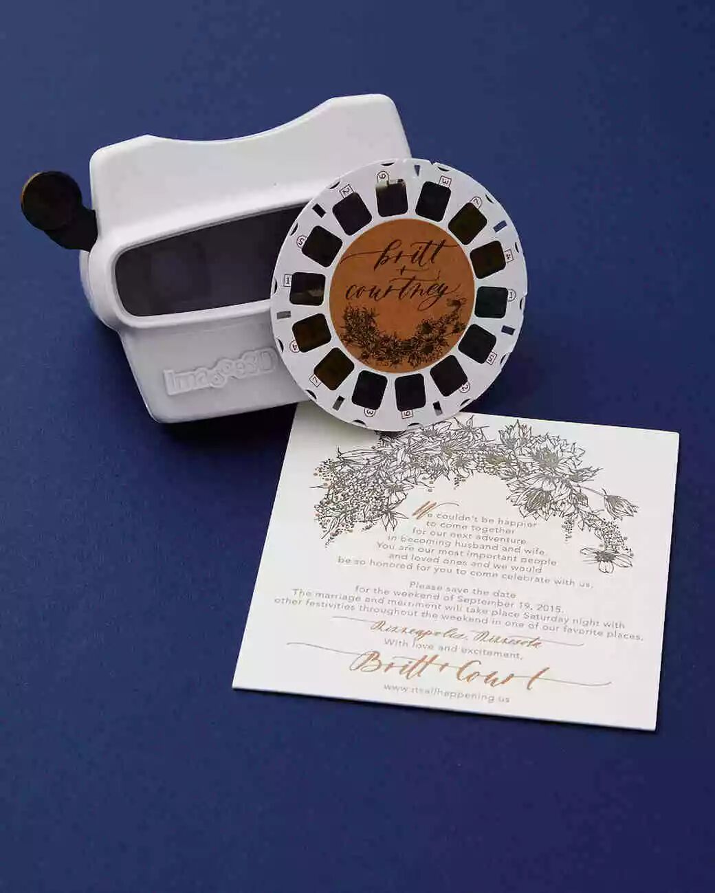 为了让客人对参加他们的婚礼感到兴奋,这对夫妇将婚礼场地所在地最佳景点的取景卷轴放在一起。 每张幻灯片上都有一两行文字,其中传达了有关婚礼的详细信息。