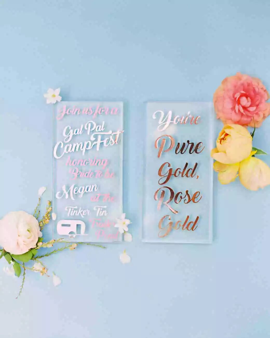 这些有机亚克力玻璃板,加上玫瑰金刻字和有趣的的拖车图形,创意满分!