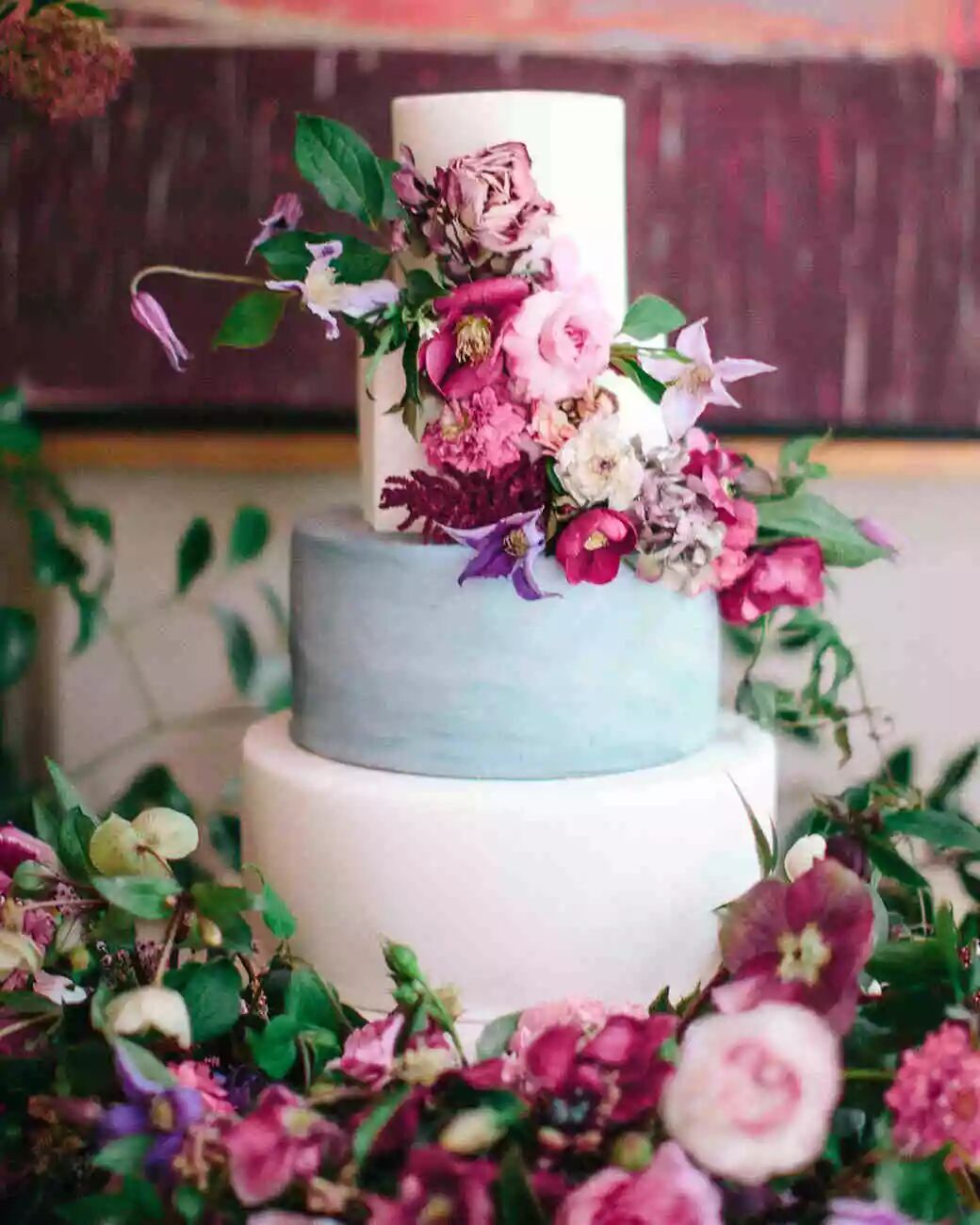 流行的色彩重新回归———只需采用加层,加上最新的彩色蛋糕趋势。情侣们通过这些重点层面为他们的甜点添加了一种受欢迎的色彩,这些层次经常引用他们婚礼的总体调色板。 如图,分层加入了一个与之形成鲜明对比的蓝色,但与此活动的粉红色主题相配合。