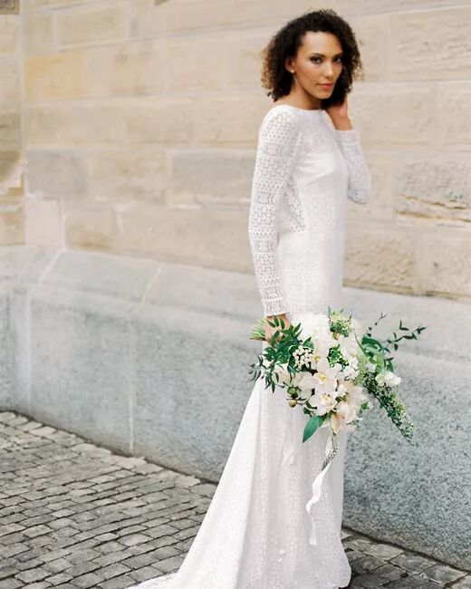 这是另一个受Meghan Markle启发的潮流:船领婚纱。 Markle简单的纪梵希(Givenchy)服装无疑激发了诱人的领口的再现,这种领口展示了你的锁骨,但没有像肩部剪裁那样引人注目。 由于其几何图案和更紧密的合身性,这位新娘的Victoria Ruesche是一个更现代的迭代。