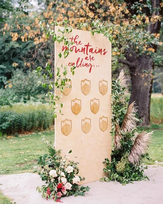 今年有很多夫妇将传统的家族徽章现代化,通常是通过交换主题元素的经典符号。 请注意如何使用这张座位表的顶部卡片,巧妙地引用了山区的设置和标牌的引用。