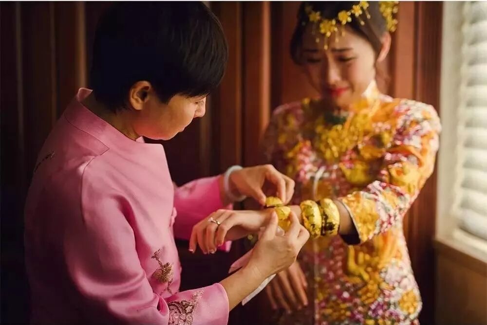 而嫁妆的金饰呢,只要有条件,父母都会给女儿准备龙凤镯、金链子,亲戚也会给,以表达父母亲人的美好祝愿,也是希望女儿嫁得体面。