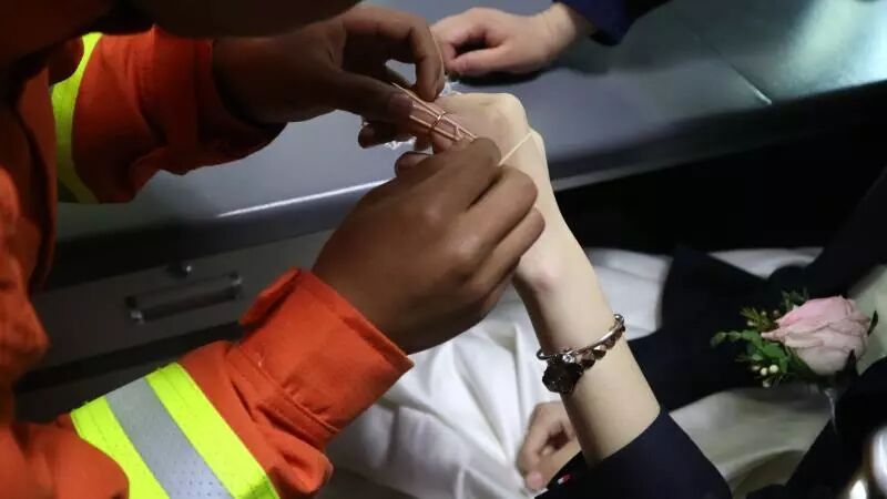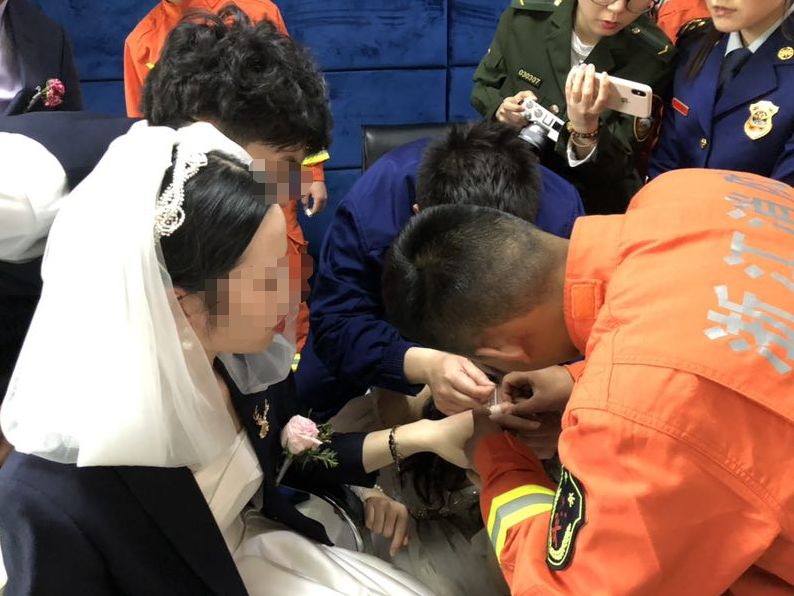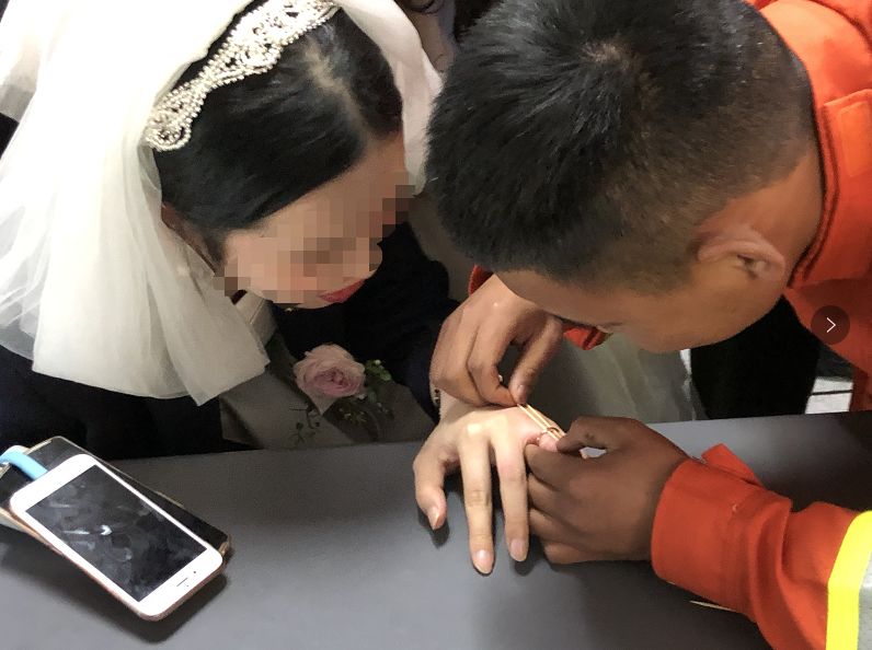 “一问情况,原来新娘的手被戒指卡住了,寻求消防的帮助。”灵隐消防中队中队长宋成暄说。