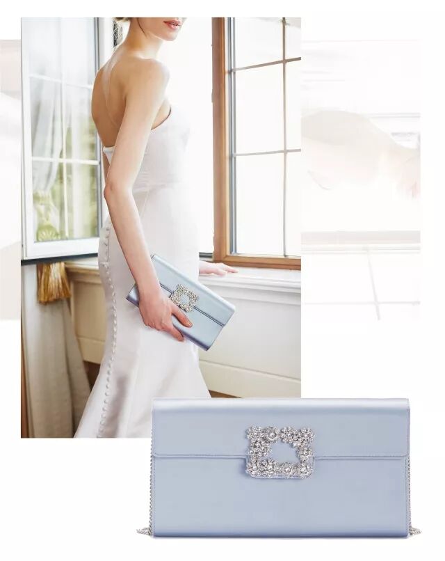 灰蓝色手包和同色的婚鞋呼应,标志性方形钻扣搭配复古简洁的婚纱,纯净又特别。让人眼前一亮!蓝色和白色的搭配出乎意料地和谐,这一组配色强推大家学起来!