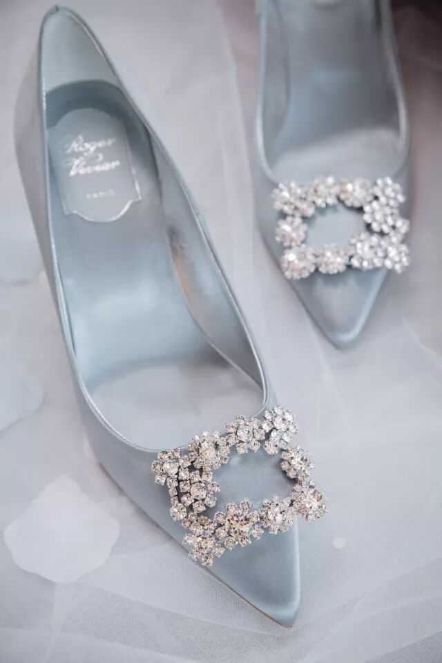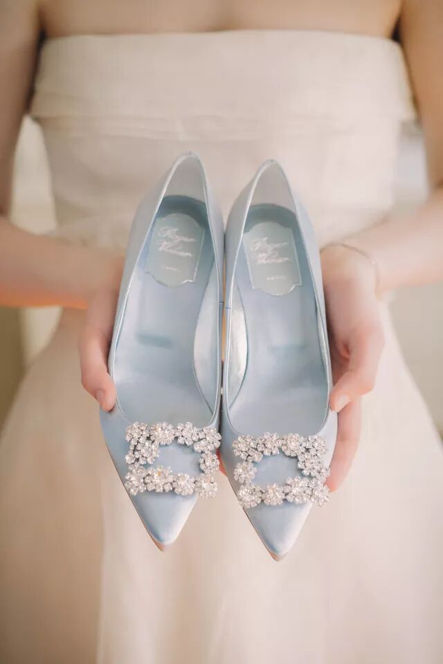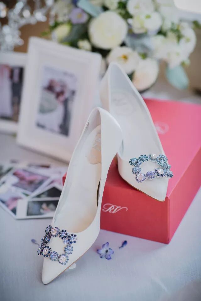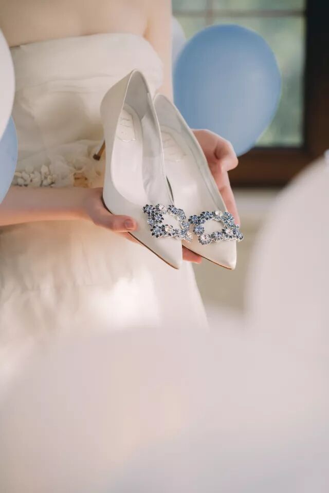 1937年在巴黎创立的Roger Vivier,以奢侈华丽、精雕细琢的鞋履而闻名。自带法式浪漫基因的它,新一季的Bridal系列婚鞋以蓝白两色为主题,灵感便来源于我们刚刚说到的习俗“something new something old, something borrowed something blue”。